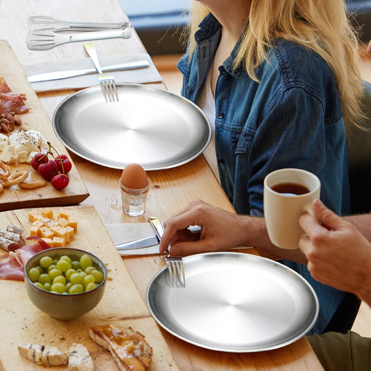 Mann, dieses Camping Geschirr Set ist perfekt für Outdoor-Abenteuer! 10 Teile für 2 Personen: 2 Tafelmesser, 2 Löffel, 2 Gabeln, 1 Steakmesser, 1 Essenszange, 2 Essteller. Alles aus lebensmittelechtem Edelstahl, super glatt poliert - keine scharfen Kanten. Kommt in ner robusten Leinwand-Tasche mit elastischen Bändern - alles hat seinen Platz und fällt nicht raus. Leicht zu reinigen, auch in der Spülmaschine. Perfekt für Camping, Picknick, Grillen, Wandern oder Bergtouren. Einfach in den Rucksack packen und los geht's! Macht jedes Outdoor-Essen zum gemütlichen Event. Ein super Geschenk für alle Naturfreunde!