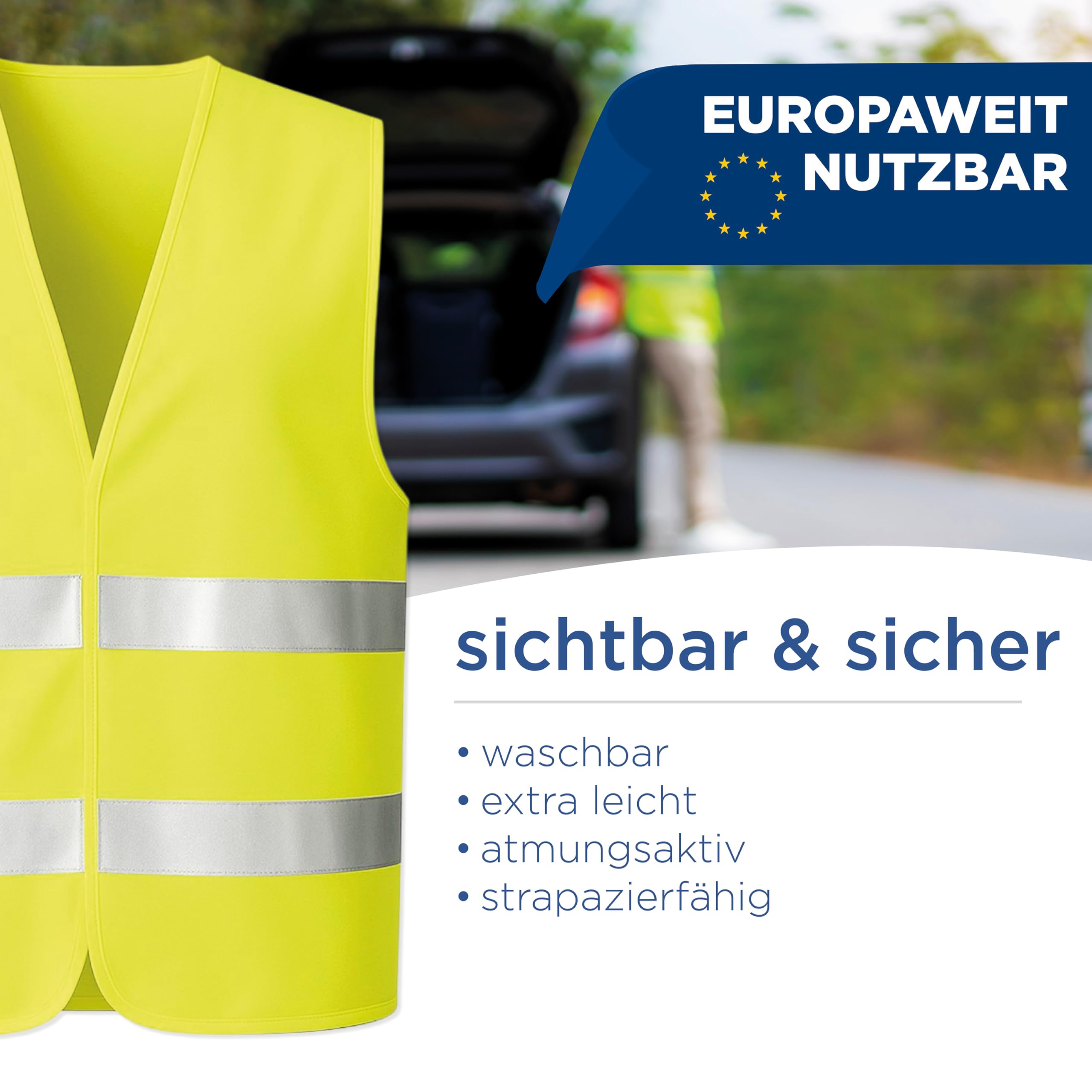 Sicherheit geht vor! Dieses 3er-Set Warnwesten in knalligem Neongelb macht dich bei Tag und Nacht sichtbar. Aus atmungsaktivem Mesh-Material super bequem zu tragen - auch über dicker Kleidung. Der Klettverschluss macht das An- und Ausziehen zum Kinderspiel. Mit 360° Reflektorstreifen wirst du schon aus 200 Metern Entfernung gesehen. Eine Größe passt für die meisten Erwachsenen - ob Mann oder Frau. Perfekt für Autofahrer, Radfahrer, Arbeiter oder Outdoor-Aktivitäten. Waschbar bei 30°C und schnell trocknend. Immer griffbereit im Auto oder der Werkstatt. Denk dran: Besser eine Weste tragen, die man nicht braucht, als sie in der Not nicht zu haben!