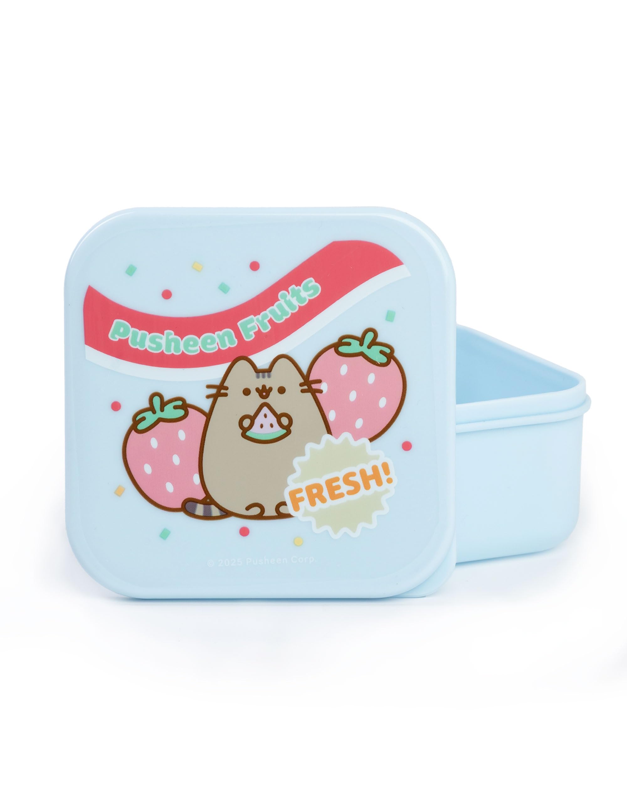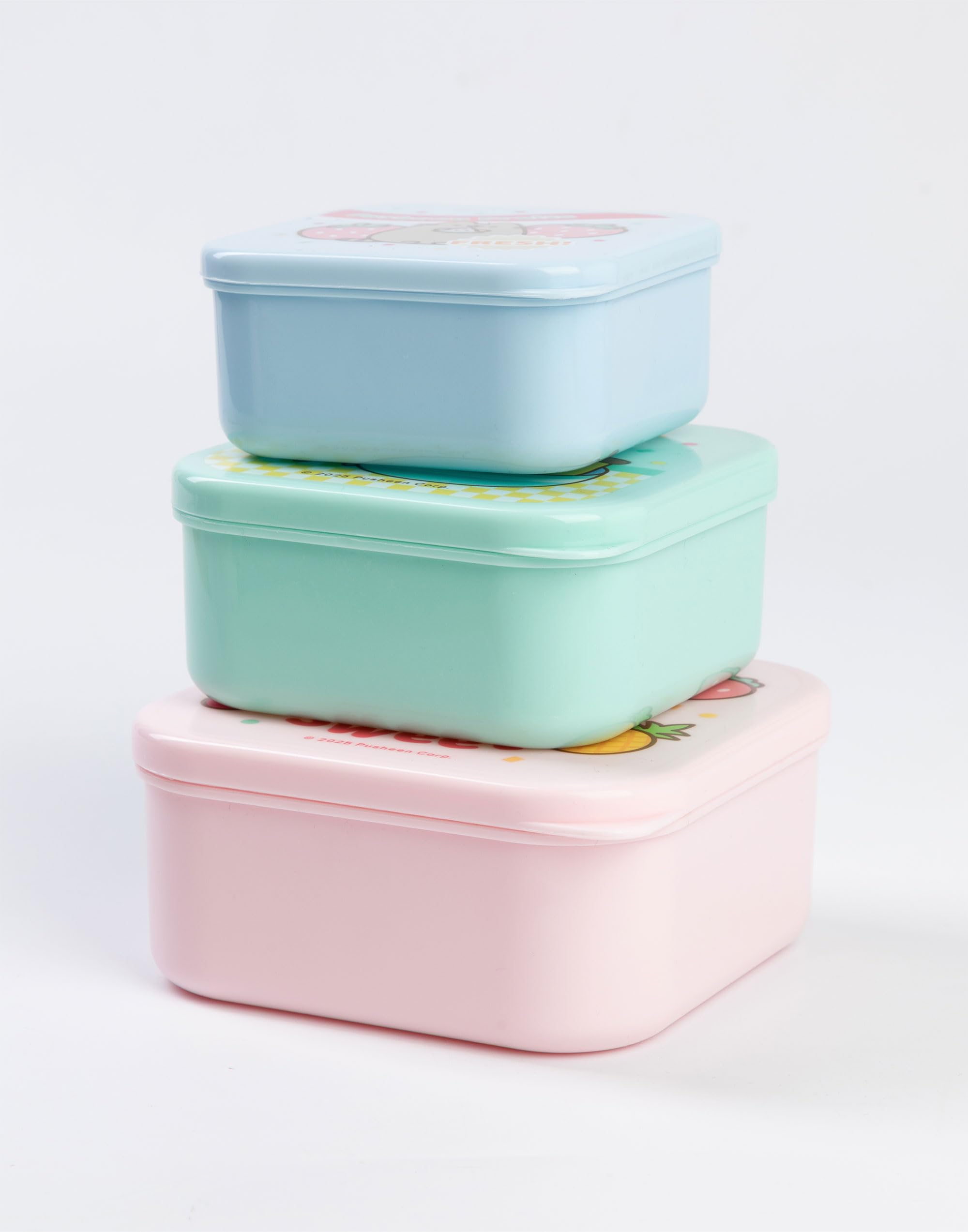 Pusheen-Fans aufgepasst! Dieses entzückende 3-teilige Snack-Set in Hellblau, Rosa und Mintgrün bringt deine Lieblingskatze in die Küche. Jeder Behälter zeigt süße Frucht-Motive und den Spruch 'Pusheen Fruits'.