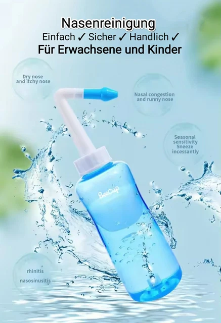 Hey, diese Nasendusche von UYGTHI macht die Nasenreinigung richtig einfach! 300 ml Fassungsvermögen, inklusive 40 Portionsbeutel Nasenspül-Salz. Mit innovativem Druckventil - kontrollierter Wasserfluss, kein unangenehmes Erstickungsgefühl! 360° goldener Winkel für gleichmäßige, tropffreie Spülung. Aus lebensmittelechtem Material in Babyflaschen-Qualität - absolut sicher und hygienisch. Zwei spezielle Sprühaufsätze für empfindliche Nasenschleimhäute - für Erwachsene und Kinder geeignet. Perfekt bei Allergien, Erkältungen, trockener Nase oder Heuschnupfen. Spült Pollen, Staub und Schleim sanft heraus. Fördert die natürliche Befeuchtung der Nasenschleimhaut. Einfache Anwendung - Salz in Wasser auflösen, Spülung durchführen. Macht das Atmen sofort leichter! Besonders in der Erkältungszeit oder bei Allergie-Saison ein echter Lebensretter. Auch zur täglichen Nasenpflege super. Hol dir dieses Set und tue deiner Nase etwas Gutes! Einfach, sicher und wirkungsvoll.