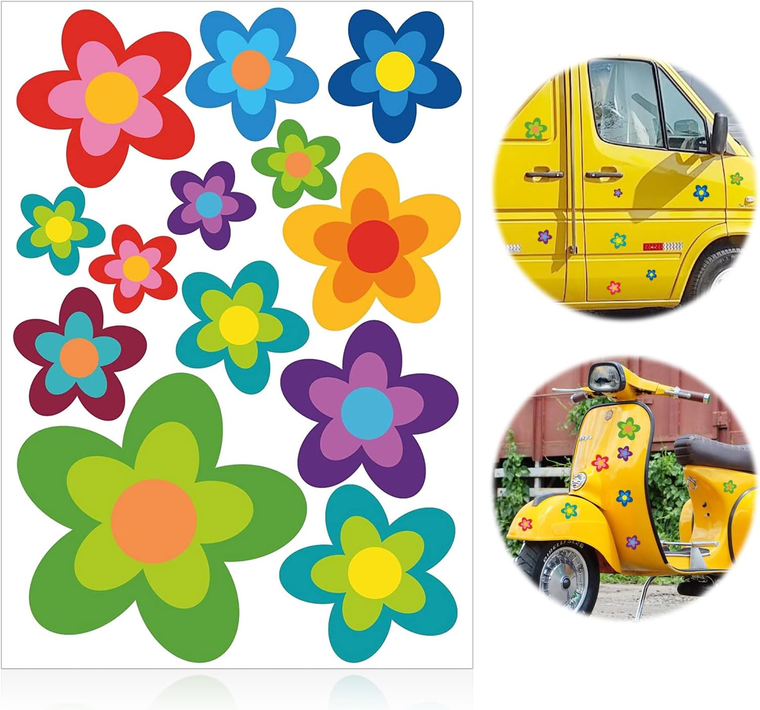 Bring Farbe auf dein Auto! Die 4 Bögen mit bunten Blumen-Aufklebern machen aus jedem Fahrzeug nen Hingucker. Aus hochwertigem Vinyl - wasserfest, UV-beständig und rückstandslos entfernbar. Einfach die Schutzfolie abziehen, aufkleben und mit dem Rakel glatt streichen - fertig! Passt nicht nur auf Autos, sondern auch auf Fahrräder, Motorradhelme, Laptops oder Koffer. Der Retro-Charme erinnert an die 70er - peace, love and flower power! Super für alle, die ihr Gefährt individualisieren wollen ohne teure Folierungen. Auch als Geschenk für DIY-Fans ne super Idee - der Kreativität sind keine Grenzen gesetzt. Einfach mal ausprobieren und dein Auto wird zum rolling Garden! Die knalligen Farben machen sofort gute Laune und du wirst überall angesprochen. Einfach, günstig und mega effektvoll!