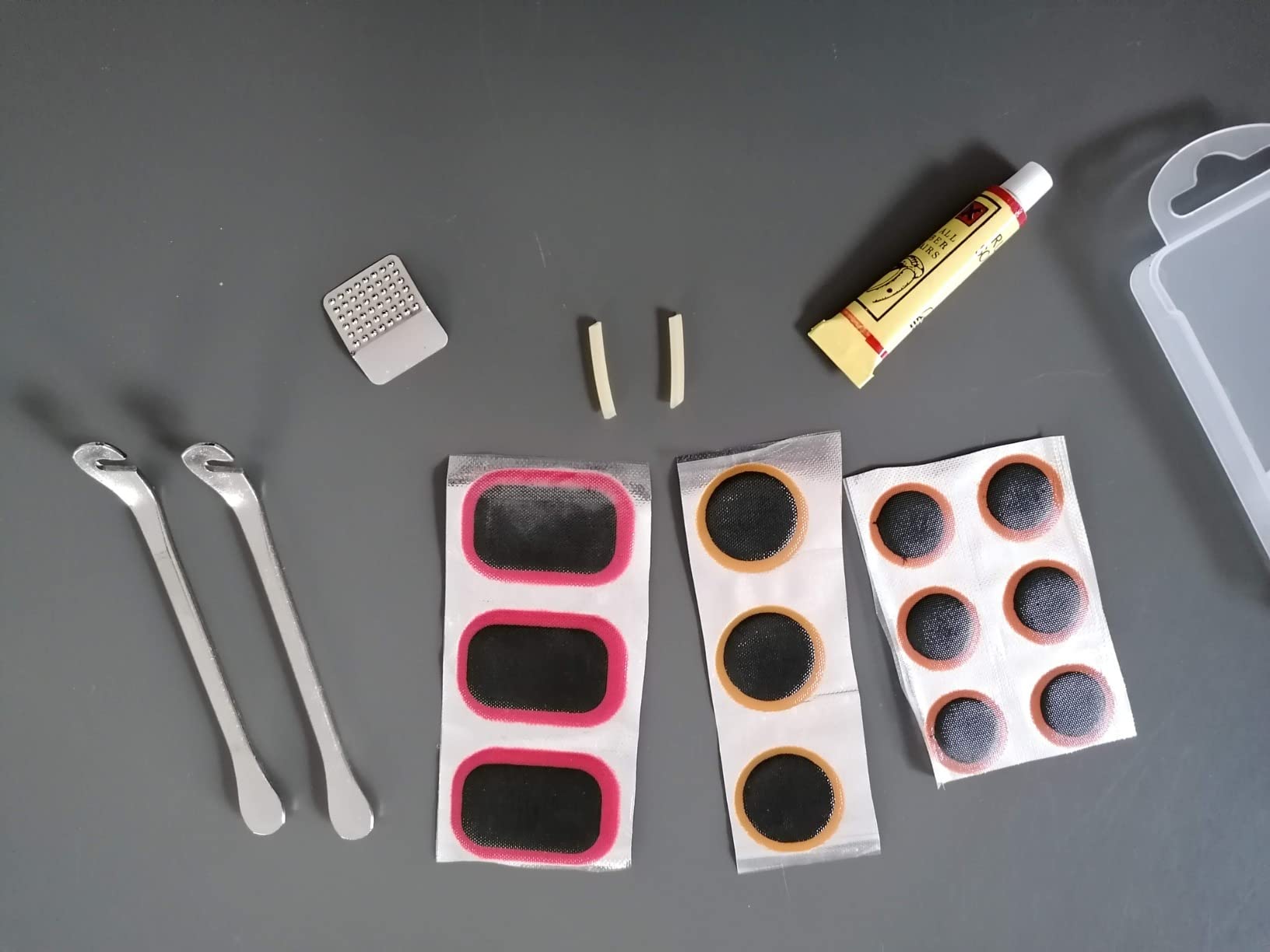 Panne? Kein Problem mit diesem mega praktischen Flickzeug-Set von AONAT! Da sind ganze 56 Teile drin - alles, was du brauchst, um deinen platten Reifen schnell wieder fit zu machen. Dabei sind verschiedene Flicken in rund und eckig, Reifenheber aus Metall, Feilen, Klebstoff und sogar ein Markierstift. Alles verpackt in einer kleinen durchsichtigen Box - passt in jede Fahrradtasche oder Jackentasche. Die Reifenheber sind aus stabilem Edelstahl, brechen nicht so leicht. Die Flicken halten richtig gut, sind dehnbar und langlebig. Egal ob du mit dem Rennrad, Mountainbike oder Citybike unterwegs bist - mit diesem Set bist du für jede Panne gewappnet. Sogar für Motorräder, ATVs oder Rollstühle geeignet! Die Reparatur geht fix - innerhalb weniger Minuten rollst du wieder. Super für Radtouren, Pendler oder einfach für den Notfall zu Hause. Mit diesem Set machst du nichts verkehrt - günstig, praktisch und komplett!