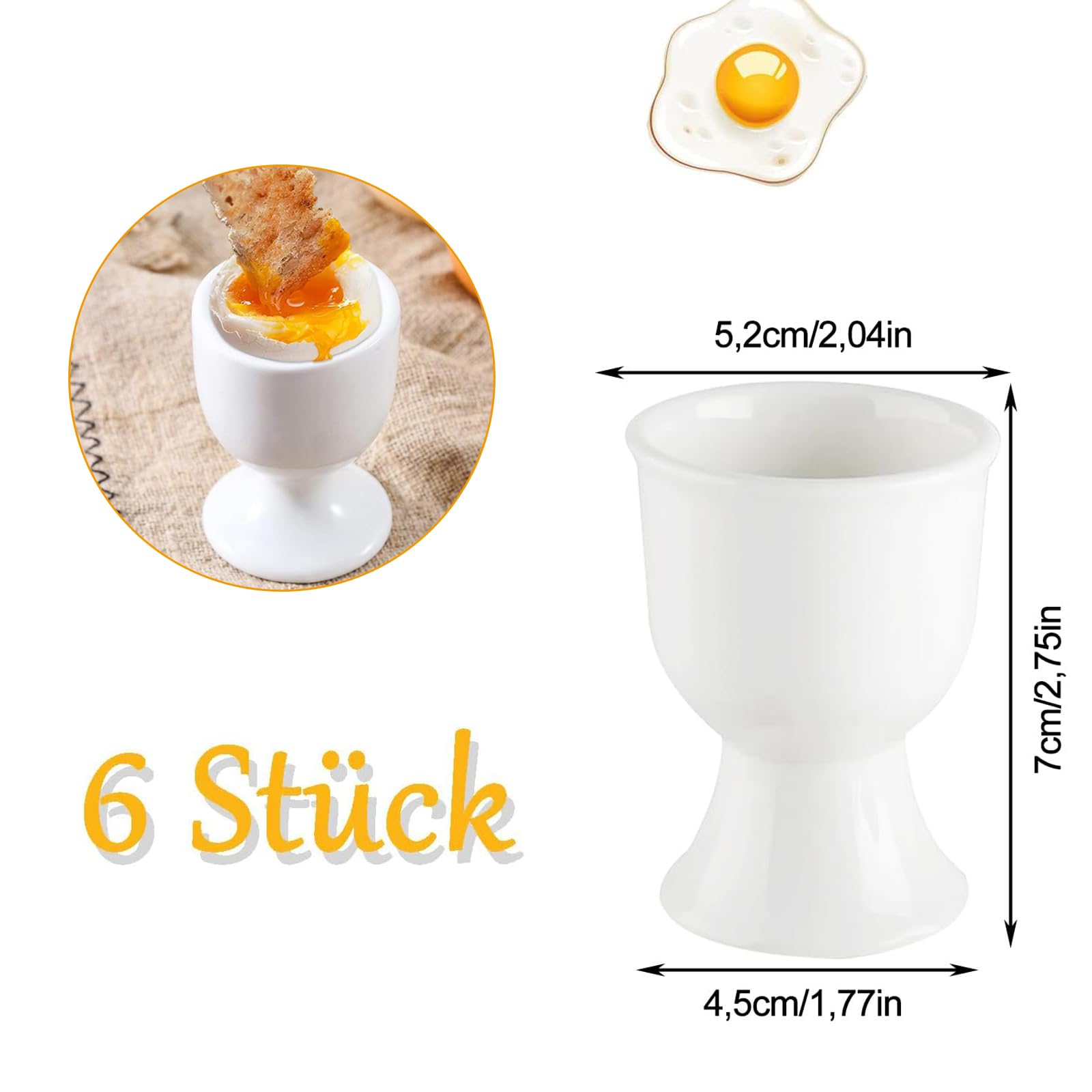 Frühstück mal anders! Diese 6 weißen Eierbecher aus Porzellan machen jedes Ei zum Event. Mit 5,2x7cm perfekt für Frühstückseier, Mittag oder Brunch. Super praktisch: Sie sind stapelbar! Wenn du sie nicht brauchst, nimmst du einfach wenig Platz weg. Der breite Boden sorgt für Stabilität - kein Wackeln auf dem Tisch. Einfach zu reinigen, spülmaschinenfest und sehen einfach schick aus. Ob für die Familie, Restaurant oder besondere Anlässe - mit diesen Eierbechern wird jedes Ei zelebriert. Aus hochwertiger Keramik, nicht dieses billige Plastikzeug. Mach deinen Frühstückstisch zum Hingucker!