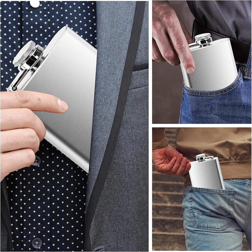 Dein Lieblingsgetränk immer dabei - diskret und sicher! Dieser hochwertige Flachmann aus APOMOONS besteht aus lebensmittelechtem 304 Edelstahl und ist der perfekte Begleiter für unterwegs. Mit 8 Unzen (ca. 237ml) Fassungsvermögen passt genau die richtige Menge für einen gemütlichen Abend rein.\n\nIm Set enthalten:\n• 1x Flachmann aus Edelstahl\n• 1x Praktischer Trichter zum einfachen Befüllen\n• Alles in stylischem Silber-Design\n\nBesondere Features:\n• Auslaufsicherer Schraubverschluss\n• Deckel fest mit Flasche verbunden - geht nicht verloren\n• Lasergeschweißt für perfekte Dichtheit\n• Spülmaschinengeeignet\n• Korrosions- und rostfrei\n\nPerfekt für:\n• Whiskey, Wodka, Rum und andere Spirituosen\n• Festivals und Konzerte\n• Camping und Outdoor-Aktivitäten\n• Jagd- und Angelausflüge\n• Hochzeiten und Feiern\n\nWarum dieser Flachmann überzeugt:\n• Passt in jede Jacken- oder Hosentasche\n• Elegantes Design - auch als Geschenk perfekt\n• Einfache Reinigung\n• Robuste Verarbeitung\n• Geschmacksneutral\n\nIdeal als Geschenk für:\n• Vatertag oder Geburtstage\n• Junggesellenabschiede\n• Outdoor-Enthusiasten\n• Whiskey-Liebhaber\n\nHol dir den diskreten Begleiter für alle Gelegenheiten - ob beim Festival, auf Reisen oder einfach für spontane Treffen mit Freunden. Dein Lieblingsdrink ist immer griffbereit!