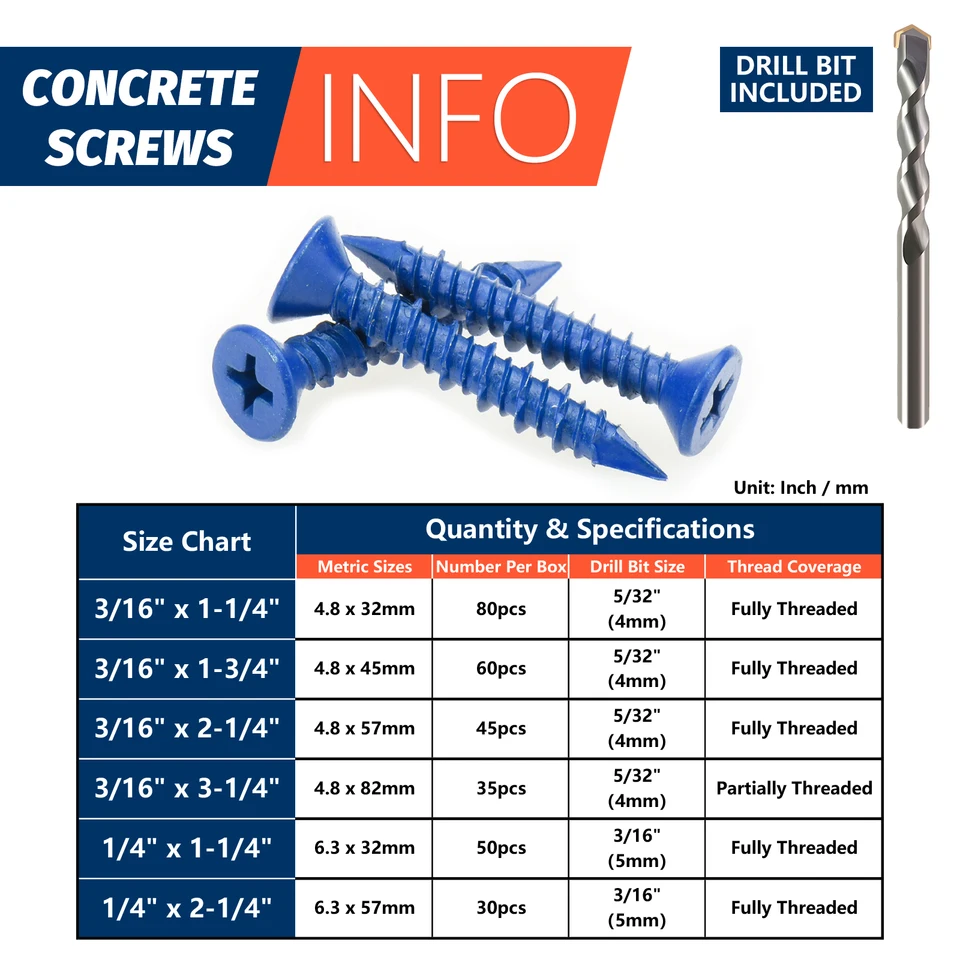 Glarks 52-tlg. Betonschrauben Set - Blaue Flachkopfschrauben Mit Bohrwerkzeug - Für Mauerwerk & Zement