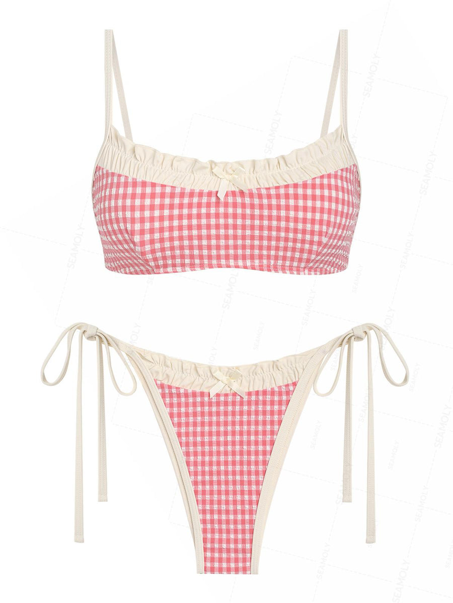 Seamoly Gingham Tankini Set - Blaues Bikini-Set Mit Schleife & Seitenschnürung