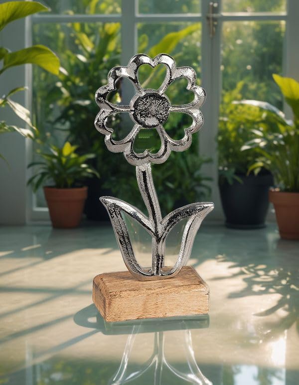 Absolute Hingucker für deine Wohnung! Dieses 2er Set Metall-Blumen auf massiven Holz-Sockeln bringt modernen Flair in jeden Raum. Eine Blume mit 10, die andere mit 6 Blütenblättern - beide 24cm hoch.