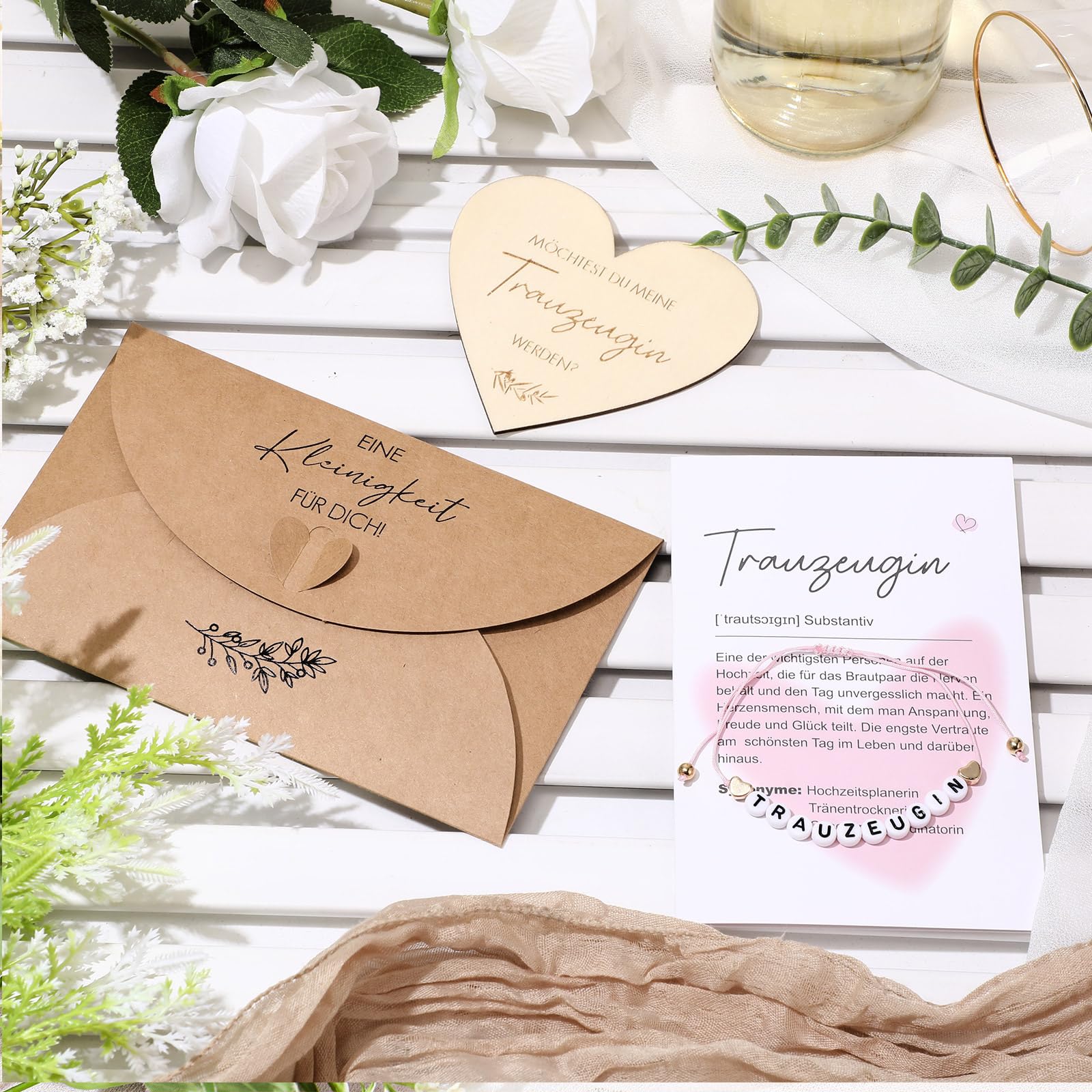 Willst du deine beste Freundin auf ganz besondere Weise fragen, ob sie deine Trauzeugin sein möchte? Dieses wunderschöne Geschenk-Set ist perfekt dafür! Enthalten ist ein adjustierbares Armband mit einer herzförmigen Holz-Plakette, auf der steht 'Möchtest du meine Trauzeugin werden?'. Dazu gibt es eine edle Einladungskarte und einen stylischen Umschlag - alles sofort verschenkfertig! Das Armband ist 19cm lang und passt fast jedem Handgelenk. Aus hochwertigem Holz gefertigt, wird es zu einem bleibenden Erinnerungsstück an diesen besonderen Moment. Viel persönlicher und emotionaler als eine einfache WhatsApp-Nachricht! Auch super für Brautjungfern oder als Dankeschön nach der Hochzeit. Deine zukünftige Trauzeugin wird garantiert gerührt sein - versprochen!