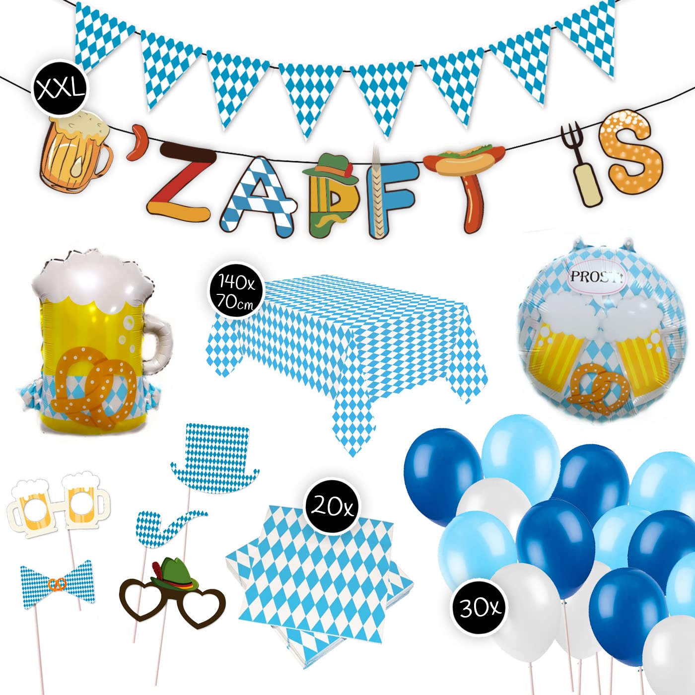 Alles für die perfekte Wiesn-Party! Dieses Komplett-Set hat alles was du brauchst: \O'ZAPFT IS\ Girlande, 10m Wimpelkette, große Tischdecke (275x128cm), 20 Servietten in Blau-Weiß, 20 Latex-Ballons, 2 Bierkrug-Folienballons und 21 Foto-Requisiten. Einfach aufhängen und dein Zuhause wird zur Oktoberfest-Halle! Die Ballons halten mit Helium bis zu 10 Stunden. Perfekt für Garten-Party, Keller-Bar oder Wohnzimmer-Feier. Mach deine Wiesn-Party unvergesslich - prost!