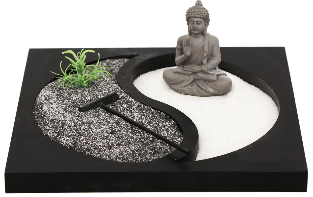 Hey, suchst du nach etwas Ruhe im stressigen Alltag? Dieser Zen-Garten von ZEN&TAO ist genau das Richtige für dich! Das komplette Set kommt in einem schicken schwarzen Holztablett (30x20x5 cm) und hat alles, was du brauchst: über 20 Miniatur-Elemente wie einen zarten Kirschblütenbaum, skurrile Figuren und sogar kleine Wasserspiele. Mit dem 7-teiligen Werkzeugset in Metallbox kannst du deine eigenen Muster in den seidig glatten Sand rechen - total entspannend! Ob im Homeoffice, im Wohnzimmer oder als Deko-Highlight - dieser Garten verwandelt jeden Raum in eine Oase der Ruhe. Du kannst die Elemente immer wieder neu anordnen und so deine persönliche Wohlfühloase schaffen. Die Chakra-Edelsteine bringen zusätzlich positive Energie. Perfekt für Meditation, Achtsamkeitsübungen oder einfach zum Abschalten nach einem langen Tag. Probier's aus und finde deine innere Balance!