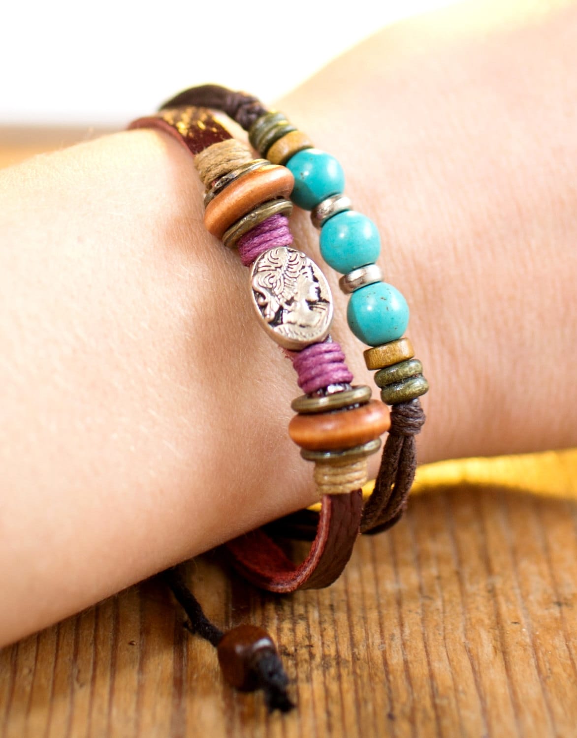 BaiDekun 2er Set Lederarmbänder Mit Perlen - Boho Style Schmuck Für Damen In Kaki & Blau