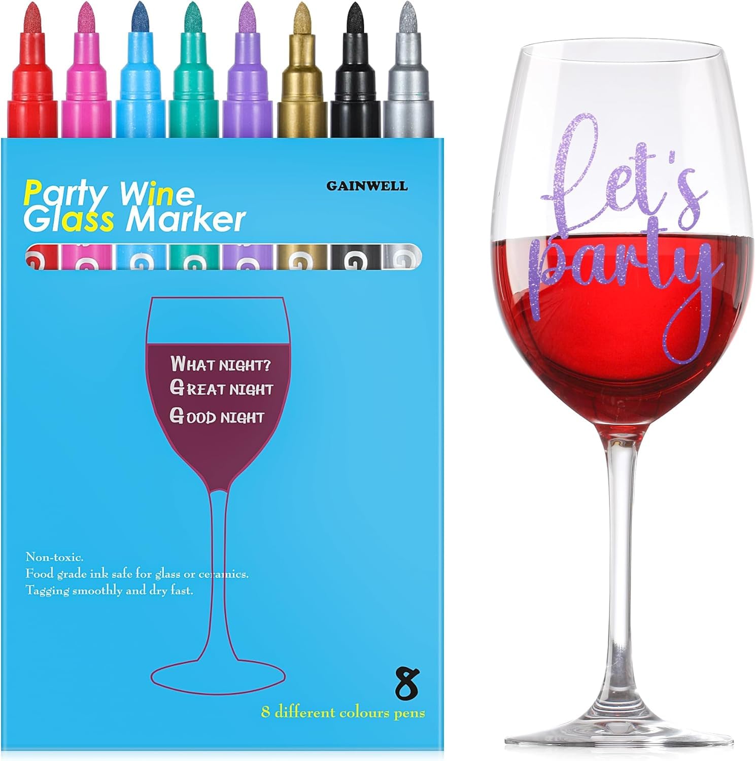 Party-Time! Mit diesen Glasstiften von LULU gibt's kein Glas-Chaos mehr. 6 coole Metallic-Farben: Rot, Grün, Blau, Gold, Silber und Rosa - für jeden Geschmack was dabei. Super praktisch: Einfach Namen oder coole Sprüche auf die Gläser schreiben, und schon weiß jeder, welches Glas ihm gehört. Die Tinte trocknet mega schnell und verwischt nicht - aber nach der Party geht sie easy mit Wasser oder in der Spülmaschine wieder ab. Perfekt für Geburtstage, Hochzeiten, Weinproben oder einfach so. Kommt in ner schicken Box - auch super als Geschenk für Party-Fans. Funktioniert nicht nur auf Gläsern, sondern auch auf Keramik, Spiegeln oder Vorratsgläsern. Einfach ausprobieren und sich über mehr Ordnung und Spaß auf Partys freuen! Macht jedes Event persönlicher und entspannter - ohne lästiges Suchen nach dem eigenen Glas.
