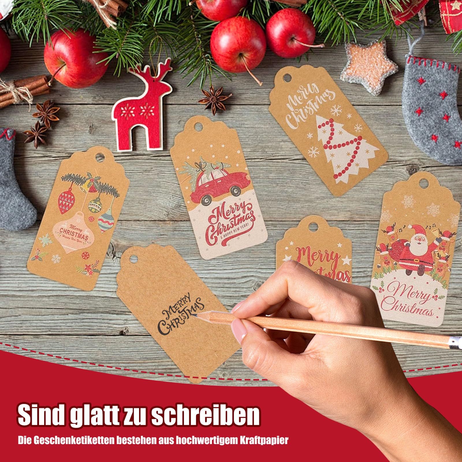 Mache deine Weihnachtsgeschenke dieses Jahr besonders persönlich! Mit diesem 50-teiligen Anhänger-Set verleihtst du jedem Präsent eine individuelle Note.\n\nWas im Set enthalten ist:\n• 50 Geschenkanhänger aus hochwertigem Kraftpapier\n• 50 Stück Bindfaden zum Befestigen\n• 10 verschiedene weihnachtliche Motive\n• Jedes Motiv mehrfach vorhanden\n\nDie süßen Motive auf den Anhängern:\n• Lustige Elche mit Weihnachtsmützen\n• Der Weihnachtsmann mit seinem Sack\n• Niedliche Schneemänner\n• Festliche Weihnachtsbäume\n• Verspielte Vögelchen\n• Pinguine im Winterlook\n\nWarum diese Anhänger so praktisch sind:\n• Einseitig bedruckt - Rückseite für persönliche Nachrichten\n• Vorgebohrte Löcher - einfaches Aufhängen\n• Aus stabilem Kraftpapier - reißfest und langlebig\n• Vielseitig einsetzbar - nicht nur für Geschenke\n\nKreative Einsatzmöglichkeiten:\n• Klassisch an Weihnachtsgeschenken\n• Als Preisschilder auf dem Weihnachtsmarkt\n• Danksagungskarten für Gäste\n• Lesezeichen für die besinnliche Zeit\n• Dekoration für Cupcakes und Kekse\n• Wunschbaum-Anhänger\n• Liebesbriefe in der Adventszeit\n• Kofferanhänger für Reisen\n• DIY Bastelprojekte mit Kindern\n\nStell dir vor: Unter deinem Weihnachtsbaum liegen wunderschön verpackte Geschenke, jedes mit einem persönlichen Anhänger versehen. Das sieht nicht nur hübsch aus, sondern zeigt auch, wie viel Mühe du dir gemacht hast.\n\nPerfekt für:\n• Familien mit vielen Geschenken\n• Weihnachtsfeiern im Büro\n• Schulklassen und Kindergärten\n• Kreative Bastelfreunde\n• Alle die persönliche Geschenke lieben\n\nMit diesem Set tauchst du voll in die weihnachtliche Stimmung ein und machst das Verschenken zu einem besonderen Erlebnis!