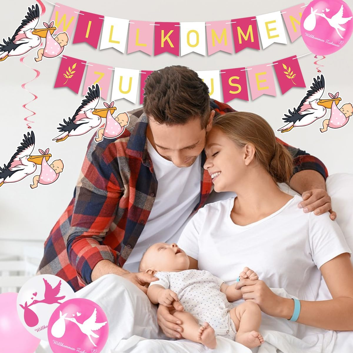 Baby Willkommens-Set Mit Storch Banner & Luftballons - Pinke Deko Für Geburtsanzeige