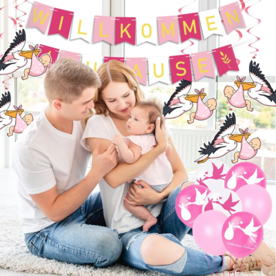 Ein Baby kommt - Zeit zu feiern! Dieses super süße Set mit Storchen-Banner und Luftballons ist perfekt um die frohe Nachricht zu verkünden. Das Banner ist 160x70cm groß aus Polyester - wetterfest und leicht zu reinigen. Dazu kommen 14 pinke Luftballons in verschiedenen Formen: Liebesballons, Sternchen, normale und Konfetti-Ballons. Mit Messingösen leicht aufzuhängen - an Gartenzaun, Balkon oder Fenster. Schafft sofort eine fröhliche Atmosphäre für die Baby-Willkommens-Party. Perfekt als Geschenk für werdende Eltern oder um selbst zu dekorieren. Nach der Feier kannst du die Konfetti-Ballons platzen lassen - macht richtig Spaß! Einfach aufhängen und alle wissen: Hier ist ein neues Erdenkind angekommen!