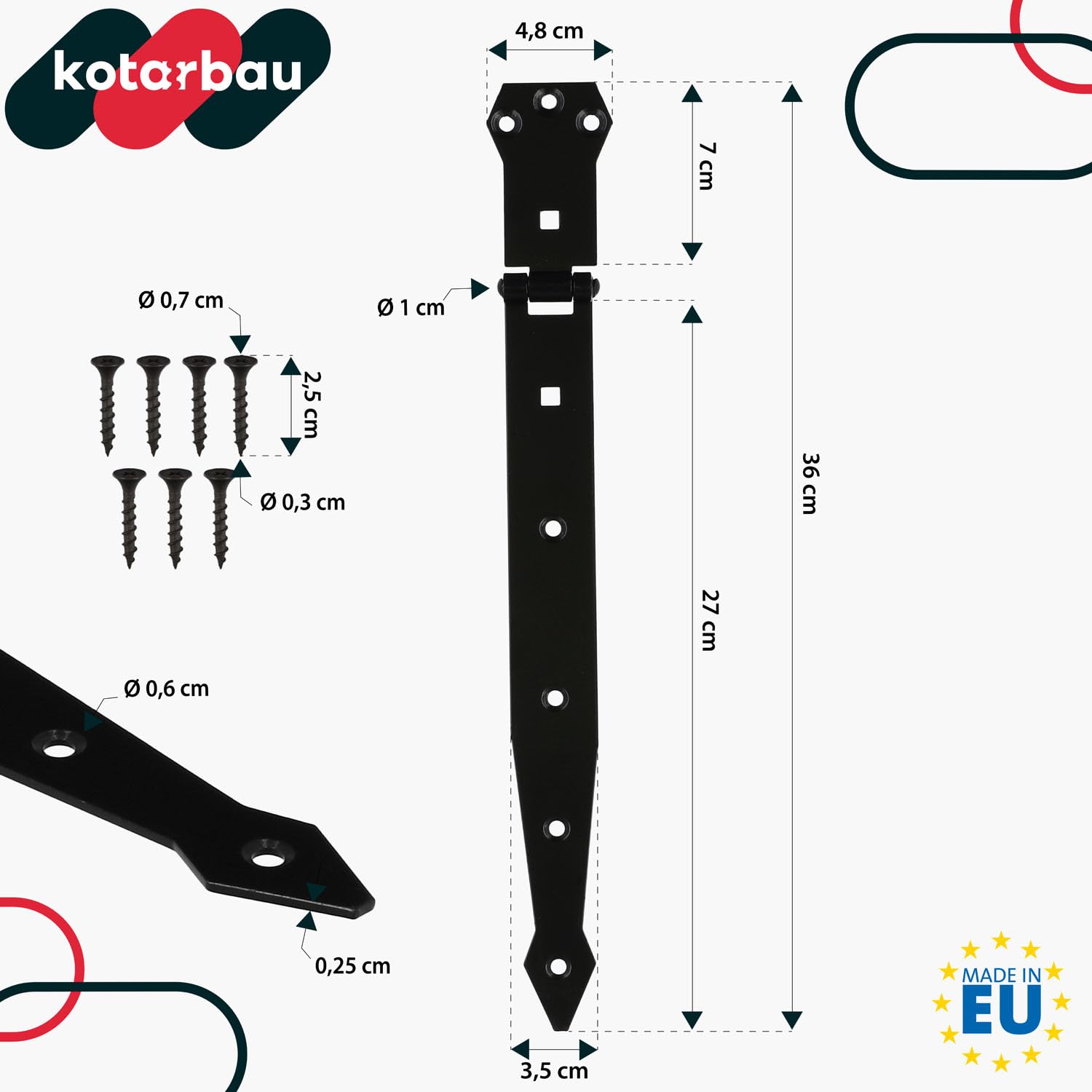 Hey, für alle Heimwerker und Profis: Diese KOTARBAU Türbänder im 2er-Set sind einfach klasse! Aus hochwertigem Stahl mit Pulverbeschichtung - rostfrei und super stabil. Maße: 360 mm lang, 35/48 mm breit, 2,5 mm stark. Perfekt für Garagentore, Gartentüren, Holztüren oder Gartenlauben. Die Montagelöcher (6 mm) machen die Installation zum Kinderspiel - mit normalem Haushaltswerkzeug erledigt. Ob draußen oder drinnen - diese Bänder halten was aus. Witterungs- und UV-beständig, dazu noch korrosionsgeschützt. Einfach montieren und jahrelang Freude haben. KOTARBAU steht für Qualität und Präzision - das merkt man! Die Bänder geben deinen Türen einen festen Halt und sorgen für einen leichten Bewegungsablauf. Einfach top für jeden, der stabile Scharniere braucht!
