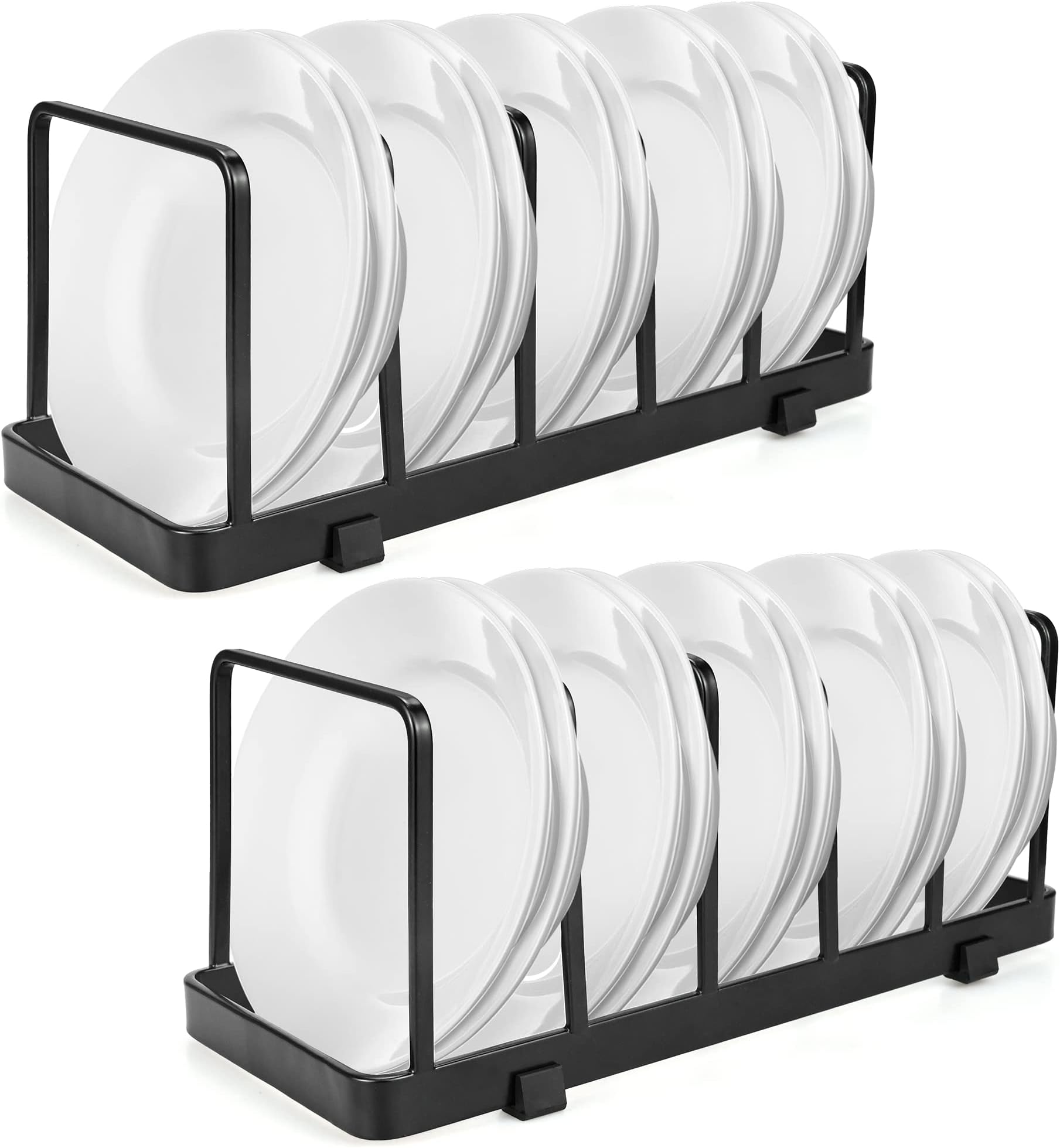 Hey, wenn in deiner Küche das Geschirr chaotisch rumliegt, dann sind diese Tellerständer genau das Richtige für dich! Im Set kriegst du 4 Stück - 2 große (20x16,5x11,7cm) und 2 kleine (14x12,5x11,7cm) - perfekt für Teller, Schüsseln und anderes Geschirr in verschiedenen Größen.\n\nDie Ständer sind aus robustem Eisen mit ner schicken lackierten Oberfläche, die wasser- und rostbeständig ist. Sie sehen nicht nur gut aus, sondern sind auch super stabil. Das hohle Bodendesign sorgt für gute Belüftung und lässt Wasser ablaufen - kannst sie also sogar als Abtropfgestell verwenden.\n\nMontieren musst du gar nichts - die Teile kommen fertig zusammengebaut und sind sofort einsatzbereit. Einfach auf die Arbeitsplatte, in den Schrank oder in die Speisekammer stellen und schon hast du ordentlichen Stauraum.\n\nAber das ist noch nicht alles: Du kannst damit nicht nur Geschirr organisieren, sondern auch Topfdeckel, Schneidebretter, Backbleche - oder sogar Bücher und CDs. Super vielseitig!\n\nEgal ob für zu Hause, im Wohnmobil oder sogar im Restaurant - diese Tellerständer bringen Ordnung in deine Küche und sparen dabei noch Platz. Einfach genial!