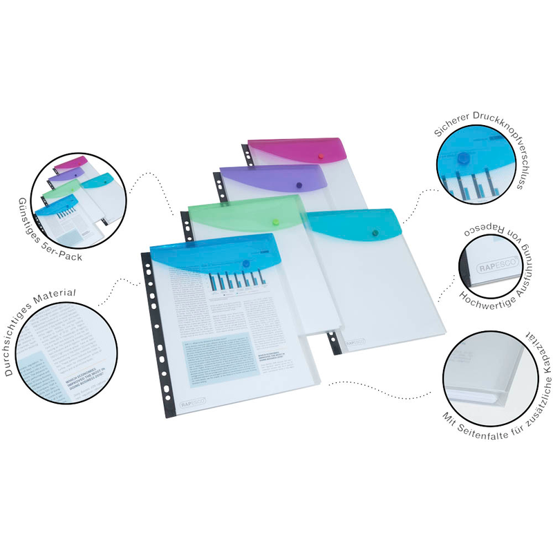 Ordnung muss sein - und mit diesen Dokumentenmappen von Rapesco klappt's perfekt! Im 5er Set in transparentem Gelb - ideal für farbige Ablagesysteme. Foolscap Format - passt für A4+ Blätter, also auch für etwas größere Dokumente. Die umfaltbare Klappe mit Druckknopf hält bis zu 150 Seiten sicher zusammen - nichts verrutscht mehr! Praktischer Stifthalter unter der Klappe - immer griffbereit. Perfekt fürs Büro, Homeoffice oder die Schule. Ob für Meetings, Präsentationen oder die Ablage - diese Mappen machen alles ordentlicher. Die transparente Farbe lässt den Inhalt erkennen - super praktisch! Beliebte Wahl für alle, die Wert auf Organisation legen. Mach Schluss mit losen Zetteln und unordentlichen Stapeln - hol dir diese zuverlässigen Helfer für deinen Alltag!