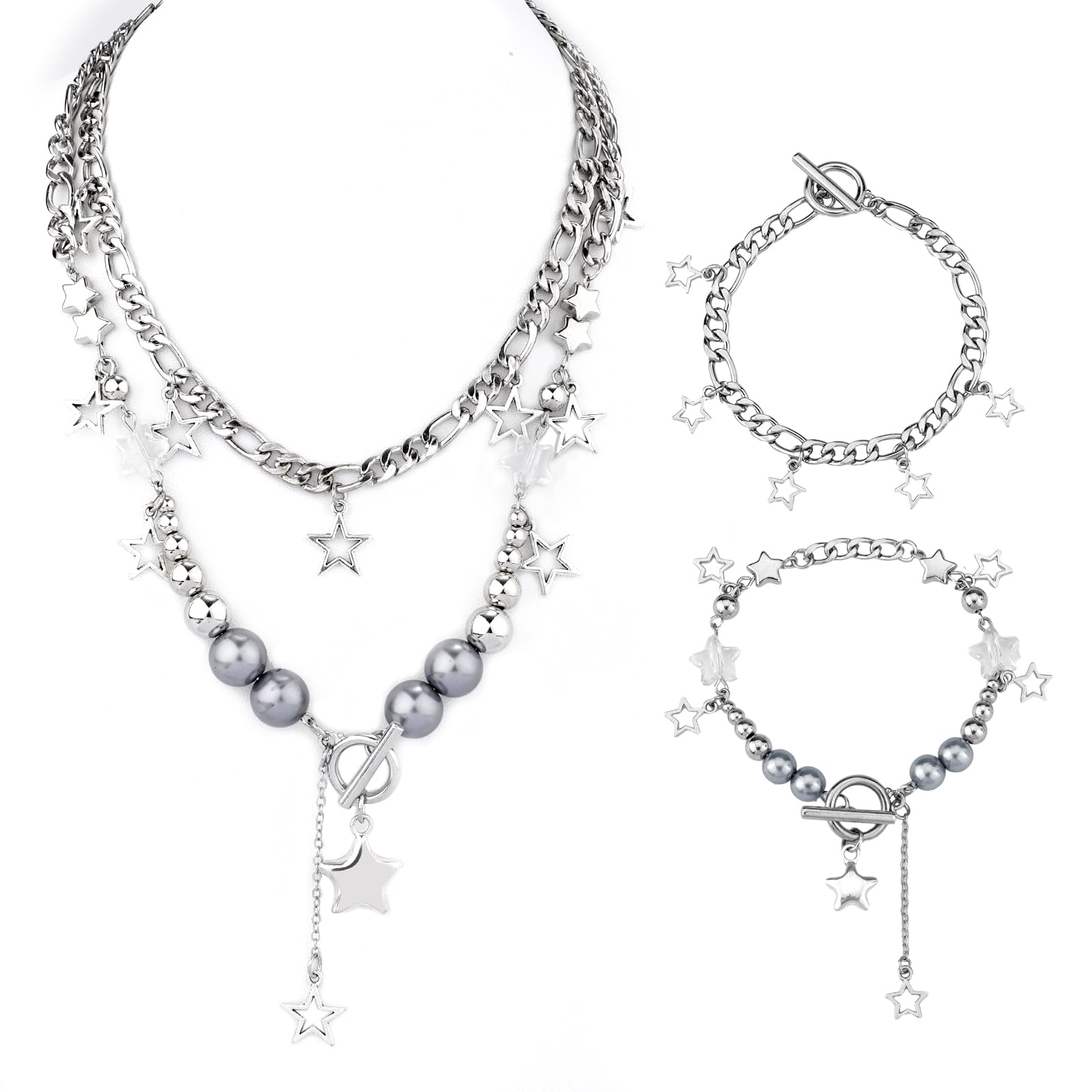 Total im Y2k-Vintage-Style! Dieses coole Schmuck-Set von Mikovivi bringt den Rockstar-Look zurück. Im Set findest du alles, was du für den perfekten Grunge-Look brauchst: drei silberne Sternen-Halsketten, zwei Armbänder, eine stylische Sonnenbrille, eine hippe Hosenkette und sogar 30 süße Sternen-Haarnadeln! Alles in silberner Optik mit coolen Rock-Elementen. Der Schmuck ist aus langlebiger Legierung und Kunststoff gefertigt, verblasst nicht und liegt angenehm auf der Haut. Perfekt für Partys, Konzerte oder einfach um deinem Alltags-Outfit etwas Pep zu verleihen. Die Sterne symbolisieren Hoffnung und Schönheit - was will man mehr? Das Set ist auch ein mega Geschenk für Geburtstage, Weihnachten oder andere besondere Anlässe. Übrigens: Die Teile lassen sich super miteinander kombinieren oder auch einzeln tragen. So kannst du deinen eigenen Style mixen! Achtung bei den kleinen Haarnadeln - die sind zwar super süß, aber nicht für Kleinkinder geeignet. Hol dir den 2000er-Jahre-Look zurück und steh aus der Menge heraus!
