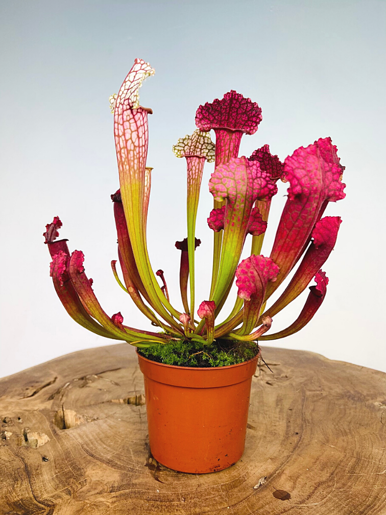 Die Pflanzen haben eine wunderschöne grüne bis rote Färbung mit lila Akzenten. Unter Sonneneinfluss werden die Farben noch intensiver. Die schlauchförmigen Blätter fangen Insekten ein - total spannend zu beobachten!