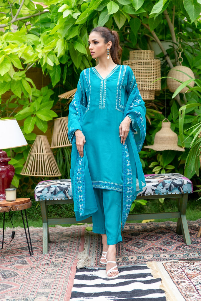Für die nächste Party oder Feierlichkeit? Dieser wunderschöne Shalwar Kameez Anzug von JIVRAJ FASHION wird alle Blicke auf dich ziehen! In einem eleganten Teal Blue gehalten, besteht das Oberteil aus Satin-Georgette mit aufwändiger Stickerei - richtig hochwertig verarbeitet. Die Ärmel sind aus Georgette mit Stickereien verziert, und die Palazzo Hosen aus Santoon sorgen für maximalen Tragekomfort. Das Dupatta aus Chinon komplettiert das Ensemble mit seiner Stickerei und den 4 seitigen Spitzenbordüren. Das Besondere: Du kannst den Anzug individuell anpassen lassen! Wenn du uns innerhalb von 10-12 Stunden nach deiner Bestellung deine Maße mitteilst, nähen wir den Anzug genau nach deinen Körpermaßen. Die Länge des Oberteils kannst du ebenfalls anpassen - standardmäßig liegt sie zwischen 111,8 cm und 116,8 cm. Wichtig: Für die Pflege empfehlen wir die chemische Reinigung. Bitte beachte, dass leichte Farbabweichungen aufgrund unterschiedlicher Monitoreinstellungen möglich sind. Dieser Anzug ist sofort einsatzbereit und perfekt für besondere Anlässe - ob Hochzeit, Festival oder kulturelle Veranstaltung. Du wirst einfach umwerfend aussehen!