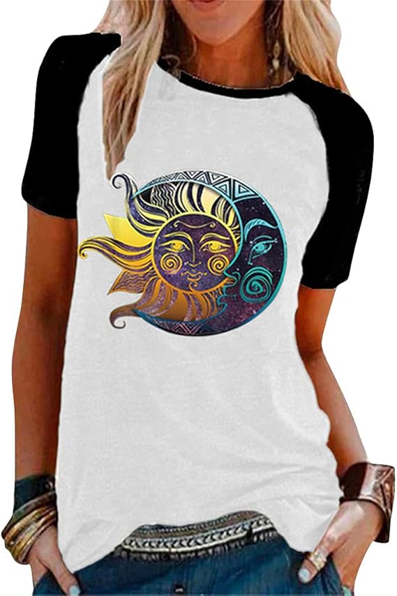 Tomwell Damen Oversized T-Shirt - Sonne Mond Motiv Shirt Mit Rundhals