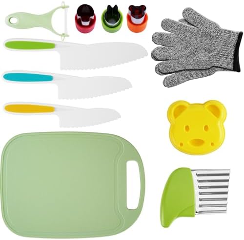 Wow, was für ein tolles Set für kleine Küchenchefs! Dieses 9-teilige Kindermesser-Set ist perfekt für Kinder von 2-8 Jahren, die gerne in der Küche helfen wollen. Enthalten sind 3 gezackte Messer in verschiedenen Größen, 3 Schneideformen, 1 Julienne-Schneider, 1 Y-Schäler und 1 Schneidebrett - also alles, was kleine Hände zum Kochen brauchen! Die Messer sind aus hochwertigem Kunststoff mit spezieller Zackenschneide, die scharf genug für Gemüse ist, aber absolut sicher für Kinderhände. Keine Sorge, dein Kind kann sich nicht schneiden! Das bunte Design weckt die Neugier und macht Lust aufs Kochen lernen. Perfekt für Montessori-Ansätze oder einfach für lustige Kochspiele zu Hause. Die Materialien sind lebensmittelecht, ungiftig und geruchlos - da kannst du beruhigt zusehen, wie dein Kind das erste Mal Gemüse schneidet. Ob für Obst, Käse oder weiches Gemüse, mit diesem Set wird Kochen zum echten Erlebnis! Super als Geschenk zu Geburtstag, Weihnachten oder einfach so. Dein Kind wird begeistert sein und lernt ganz nebenbei, wie man sicher mit Küchenutensilien umgeht. Einfach auspacken und loskochen - der Spaß ist garantiert!
