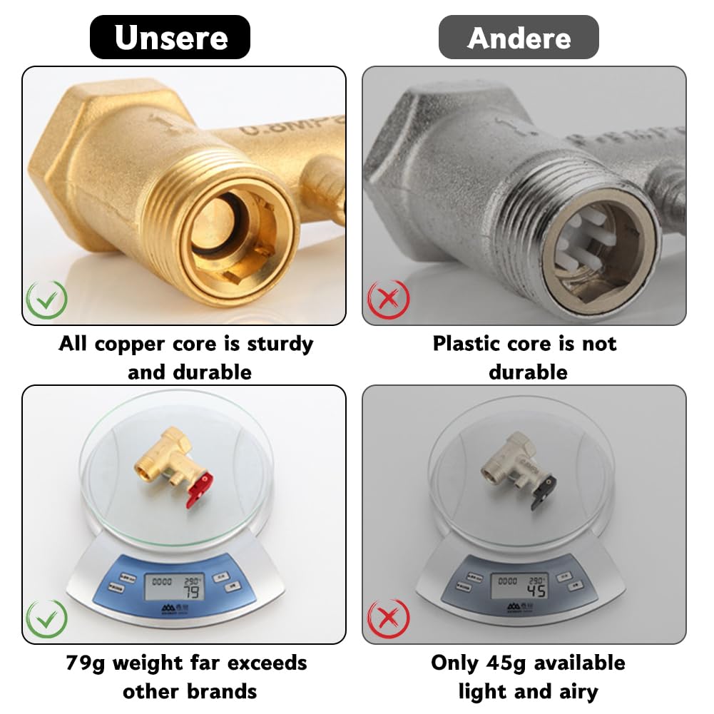 Brauchst du ein neues Sicherheitsventil für deinen Warmwasserbereiter? Dieses 0.7 MPa Membranventil ist die perfekte Lösung! Aus hochwertigem Messing gefertigt, hält es Druck, Hitze und Korrosion stand. Die integrierte Rückschlagfunktion verhindert, dass heißes Wasser zurück in die Leitung fließt - das spart Energie! Mit DN15 1/2\ Gewinde passt es als direkter Ersatz für die meisten alten Ventile. Einfach das defekte Ventil austauschen und schon bist du wieder auf der sicheren Seite. Geeignet für Haushalte und gewerbliche Anwendungen bei Temperaturen von -10°C bis 120°C. So sorgst du für sicheren Betrieb deines Warmwassersystems!