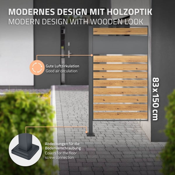 Endlich keine hässlichen Mülltonnen mehr im Garten! Dieser Zaun in schicker Anthrazit-Optik mit Holzlook versteckt deine Mülltonne diskret. Maße: 91x91x150cm - passt für 60, 120 oder 240 Liter Tonnen. Aus pulverbeschichtetem Stahl - absolut witterungsbeständig und pflegeleicht. Das Geniale: Du kannst mehrere Zäune kombinieren für mehrere Tonnen! Einfacher Aufbau, inklusive Bodenbefestigung. Mit 20cm Abstand zum Boden für gute Belüftung. Sieht aus wie teures Holz, ist aber praktisches Metall. Mach deinen Garten sofort schöner - bestell jetzt deinen Mülltonnen-Verstecker!