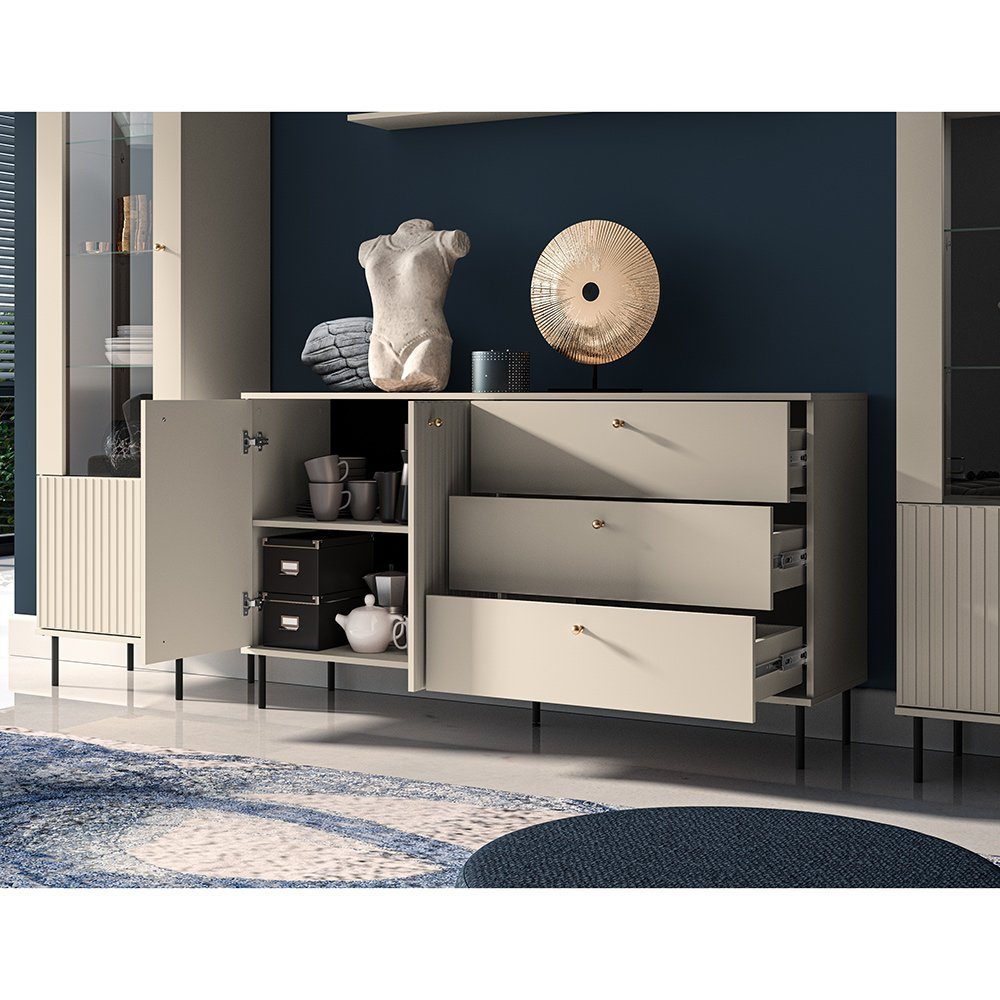 Wow, was für ein elegantes Möbelstück! Diese Maggiore Kommode in trendigem Kaschmir mit cremefarbener, matter Oberfläche wird dein Wohnzimmer oder Schlafzimmer aufwerten. Mit 154,5cm Breite, 82,6cm Höhe und 39cm Tiefe bietet sie die perfekten Proportionen. Das besondere Detail: Die dezenten Rillen auf den Schubladenfronten verleihen dem Sideboard eine einzigartige Tiefe und Charakter. Die edlen goldenen Griffe setzen luxuriöse Akzente und die schlanken goldenen Metallfüße geben modernen Schwung. Aus hochwertigen Holzwerkstoffen und Metall gefertigt - stabil und langlebig. Mit 3 Schubladen bietet sie reichlich Stauraum für Deko, Geschirr oder Wohnaccessoires. Perfekt für Flur, Wohnzimmer oder Schlafzimmer. Dieses Sideboard verbindet Funktionalität mit modernem Design und verleiht jedem Raum eine warme, einladende Atmosphäre. Ein echter Hingucker der sich nahtlos in verschiedene Einrichtungsstile integriert - ob skandinavisch, modern oder zeitgenössisch. Hol dir dieses stylische Möbelstück und verleihe deinem Zuhause das gewisse Etwas!