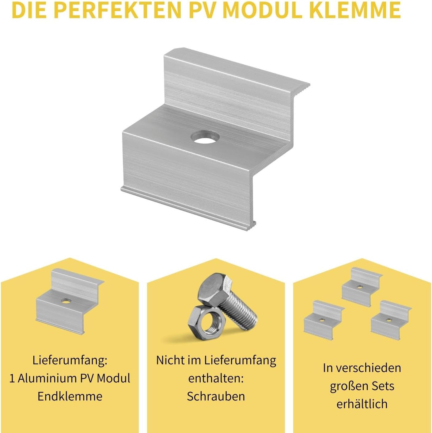 Diese Solar-Endklemmen sind genau das Richtige für deine Photovoltaik-Anlage! Aus robustem Aluminium halten sie jeden Wetterbedingungen stand. Speziell für Module mit 30mm Höhe und 35mm Aluminiumprofile designed. Im 10er-Set inklusive aller Schrauben - alles da für eine professionelle Montage. Die silberne Farbe fügt sich dezent in die Anlage ein. Einfach unverzichtbares Zubehör für eine sichere und dauerhafte Installation deiner Solarmodule!