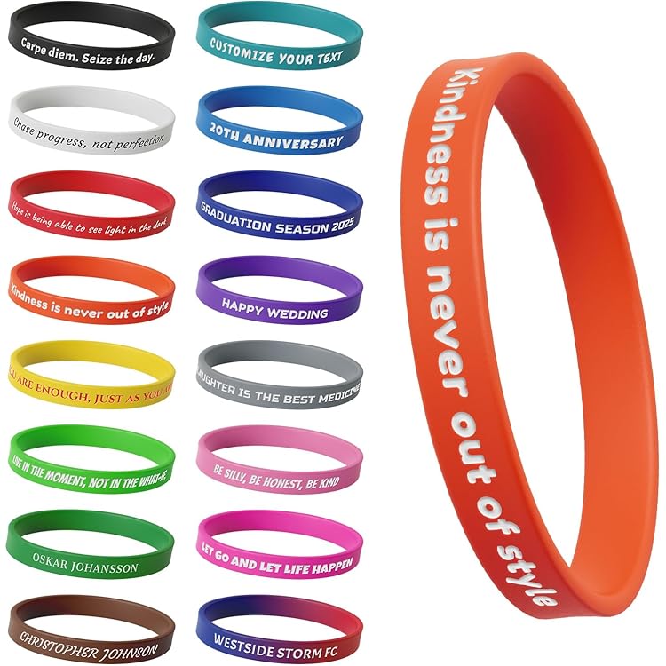 Perfekte Armbänder für deine Veranstaltung! Diese hochwertigen Silikonarmbänder lassen sich komplett individualisieren - mit deinem Logo, Text oder Motiv auf beiden Seiten. Erhältlich in 17 verschiedenen Farben und 4 Größen (180mm, 190mm, 202mm, 210mm), sodass für jeden Handgelenk die passende Größe dabei ist. Hergestellt aus 100% elastischem Silikon, super weich und angenehm zu tragen, ohne die Haut zu reizen. Die Lasergravur ist wasserfest, langlebig und sieht auch nach monatelangem Tragen noch wie neu aus. Ideal für Firmenevents, Hochzeiten, Festivals, Sportveranstaltungen, Spendenaktionen oder als Give-away für Kunden. Einfach Farbe und Größe wählen, dein Design hochladen und schon hast du professionelle Armbänder, die deine Botschaft perfekt transportieren!