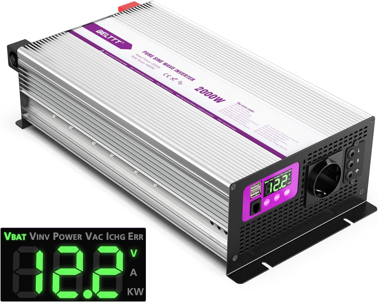 BELTTT Reiner Sinus Wechselrichter 2000W 12V - Mit LED Display & EU Steckdose