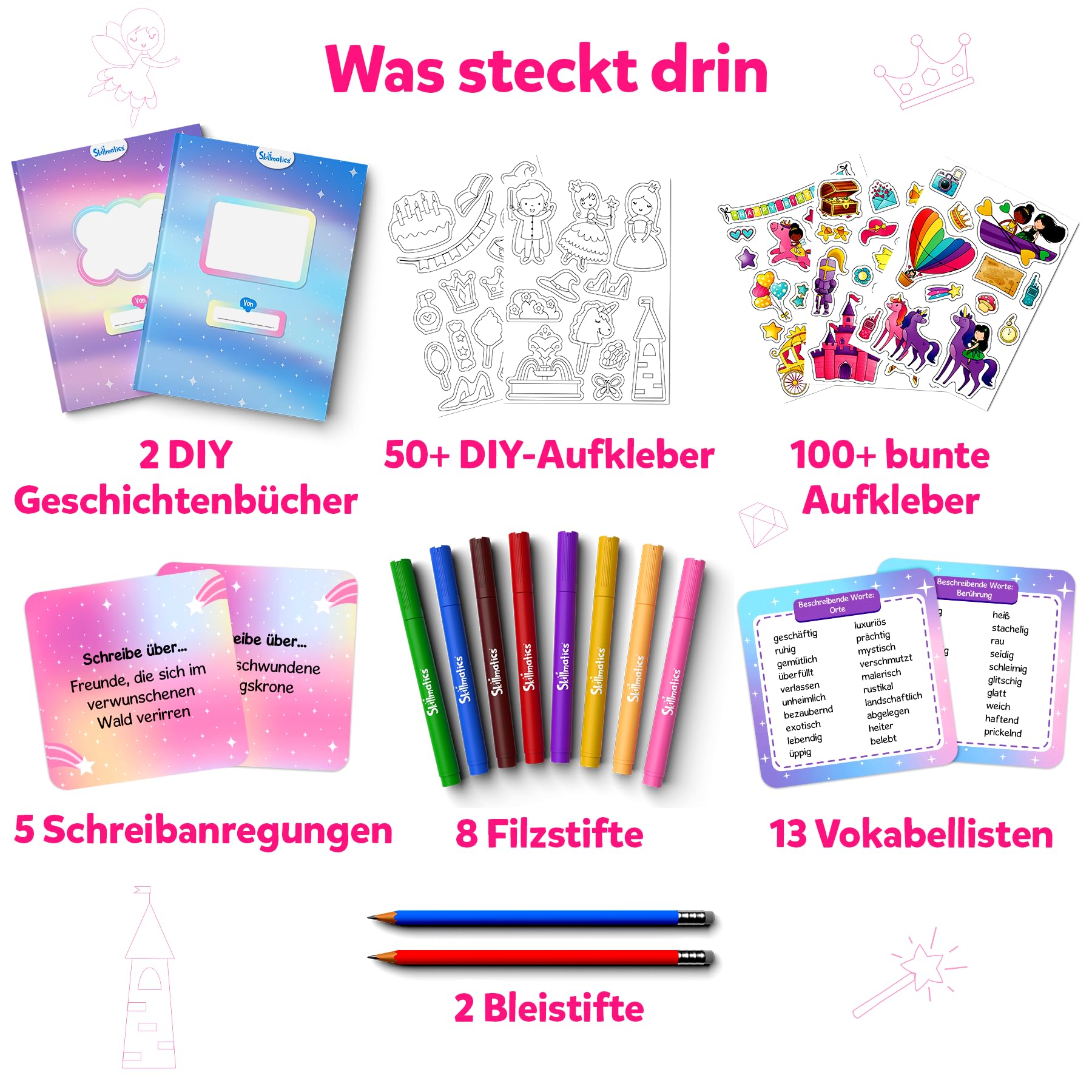 Das Skillmatics Kratzkunstbuch entführt Kinder in eine magische Welt voller Einhörner und Prinzessinnen! Einfach mit dem beiliegenden Holzstift über die schwarzen Flächen kratzen und schon erscheinen bunte Bilder in Regenbogenfarben. Mit über 30 Kratzaufklebern können die Kunstwerke noch persönlicher gestaltet werden. Alles komplett schmutzfrei - kein Malen, kein Kleckern, nur kratzen und staunen! Perfekt für unterwegs im Auto, Flugzeug oder Zug. Das kompakte Set passt in jeden Rucksack und beschäftigt Kinder ab 3 Jahren stundenlang. Hergestellt aus ungiftigen, kindersicheren Materialien. Fördert kreatives Denken, Feinmotorik und Konzentration - Lernen durch Spielen! Das ideale Geschenk für kleine Künstler, die Einhörner und Prinzessinnen lieben. Inhalt: 10 Kratzbilder, 2 Holzstifte, 30+ Aufkleber. Einfach magisch!