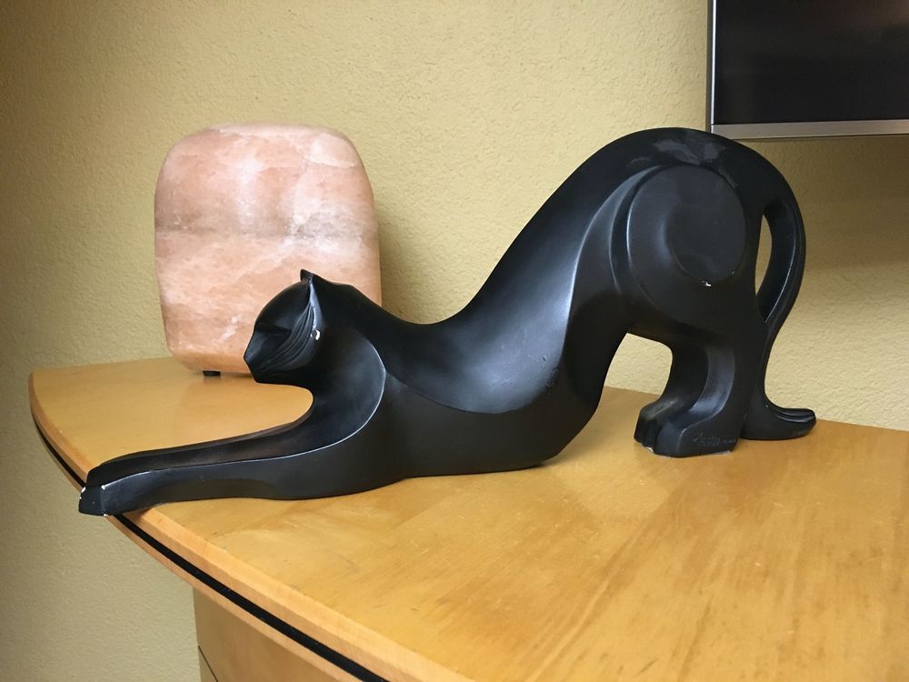 Das marmorartige Finish verleiht der Skulptur einen edlen Glanz, und die bernsteingelben Augen scheinen richtig lebendig zu wirken. Die glatten Linien und die moderne Ästhetik passen super zu Zimmerpflanzen, Holzmöbeln oder Metall-Akzenten.