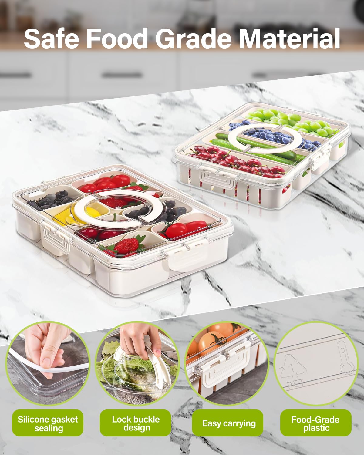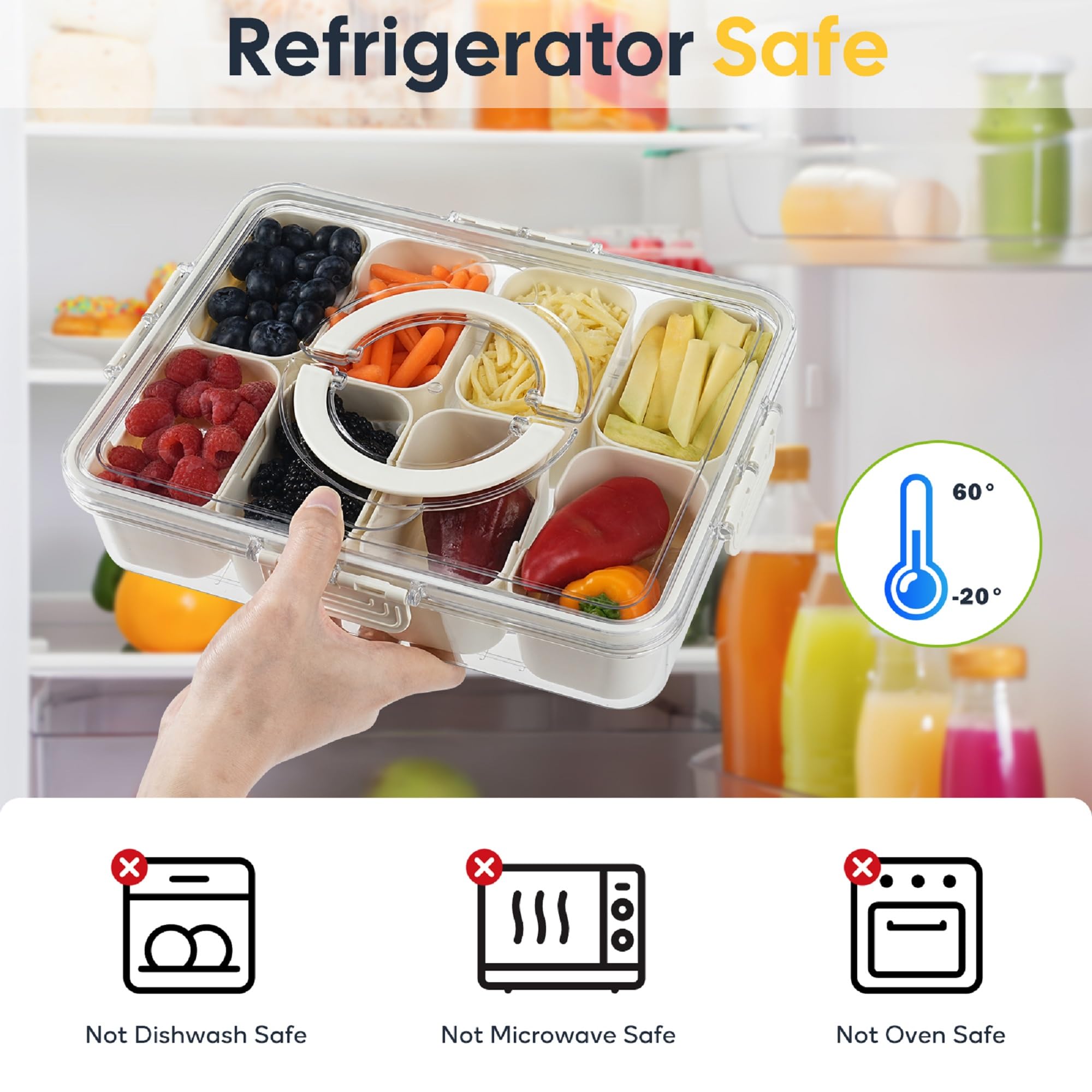 Perfekt für Picknicks, Partys und unterwegs! Diese praktische Snackle Box mit 8 herausnehmbaren Fächern hält deine Leckereien perfekt getrennt und organisiert. Der inkludierte wiederverwendbare Eisbeutel sorgt dafür, dass alles 5-7 Stunden frisch und kühl bleibt - ideal für ganztägige Ausflüge. Aus transparentem Material, sodass du auf einen Blick siehst, was wo ist. Das innovative Design hat ein Entlüftungsloch zum Druckablass, eine Datumsmarkierung zur Frischekontrolle und einen stabilen Tragegriff für mühelosen Transport. Perfekt für Obst, Gemüse, Snacks, Süßigkeiten, Charcuterie oder sogar Salate. Ob für Road Trips, Büropartys, Geburtstagsfeiern oder Familienausflüge - diese Box macht jede Mahlzeit unterwegs zum besonderen Erlebnis. Einfach befüllen, Eisbeutel hinzufügen und los geht's! Deine Snacks bleiben frisch, getrennt und appetitlich - mehr Komfort für unterwegs geht kaum!