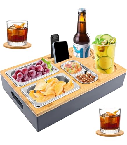 Sofa Ritzentablett Aus Holz - Mit 2 Getränkehaltern, Ablage Für Snacks & Fernbedienung