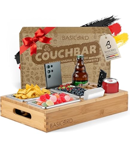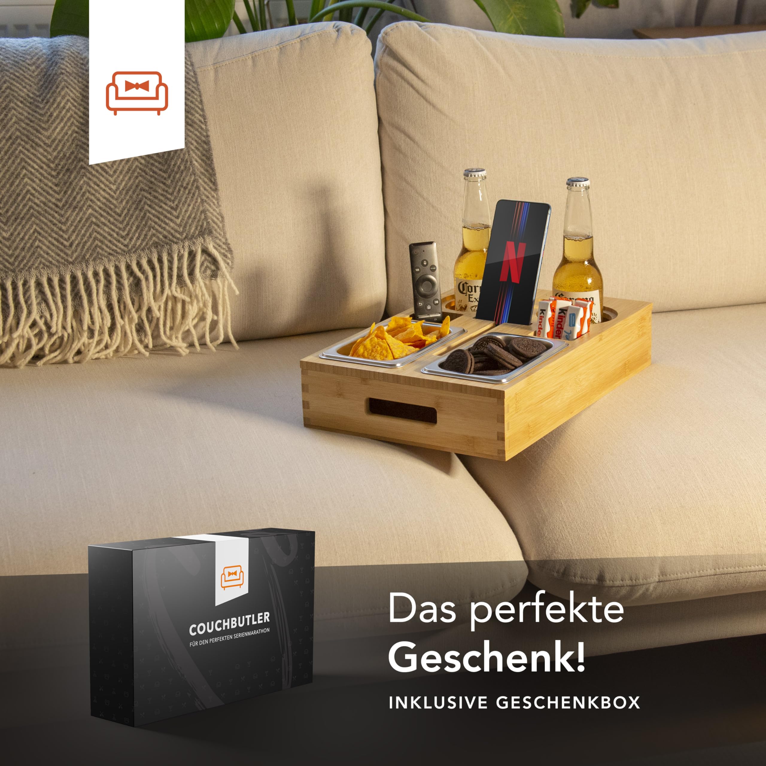 Wie hast du nur ohne dieses Teil leben können? Dieses geniale Sofa-Tablett wird einfach in die Ritze zwischen Sitz und Rückenlehne gesteckt - und sitzt bombenfest! Kein Wackeln, kein Verrutschen, selbst wenn du dich mal bewegst. Mit zwei praktischen Getränkehaltern für dein Bier, deinen Wein oder deinen Kaffee, und einer großen Ablagefläche für Snacks, das Handy oder die Fernbedienung. Das runde Design sieht super stylisch aus und passt zu jeder Couch. Endlich musst du nicht mehr aufstehen, wenn du was zu trinken brauchst oder die Fernbedienung weggelegt hast. Perfekt für Filmabende, Serienmarathons oder einfach nur gemütliches Chillen auf dem Sofa. Deine Couch wird's dir danken!