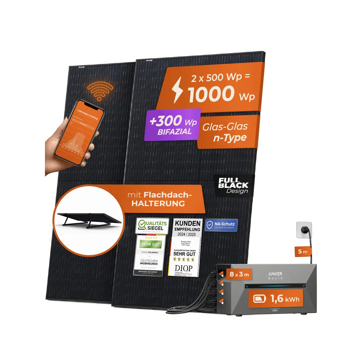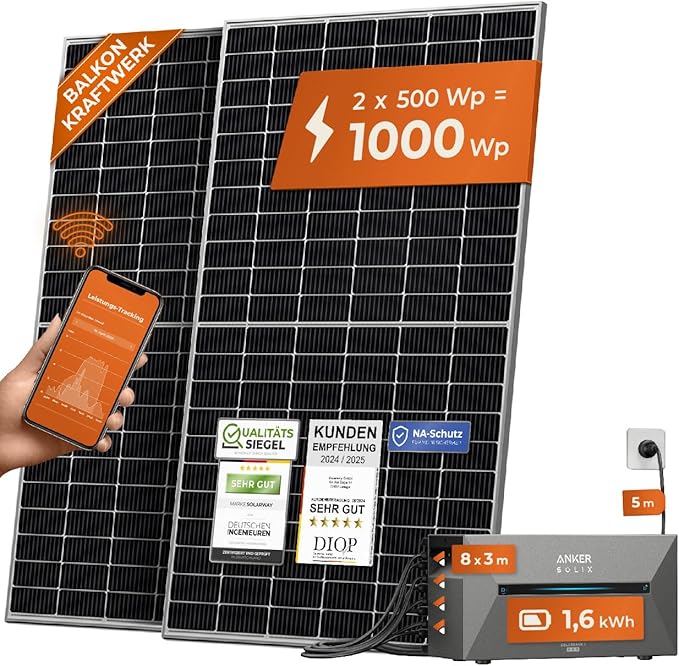 Energie-Sparer aufgepasst! Dieses Solarway Balkonkraftwerk mit Speicher ist die Zukunft für dein Zuhause! All-in-One Lösung mit Wechselrichter und 2,56 kWh Batterie in einem Gerät - das spart Platz und ist super effizient. Mit 4 bifazialen JaSolar-Modulen à 500W - die liefern bis zu 30% mehr Leistung! Du kannst jetzt 800W ins Netz einspeisen - das ist erlaubt und spart richtig Geld! Die n-Type Technologie bringt dir 2 Stunden mehr Strom pro Tag. Einfach per Stecker in die Steckdose stecken (3m Kabel inklusive) und schon produzierst du deinen eigenen Strom! Über die Marstek App behältst du immer den Überblick - siehst live wie viel Strom du produzierst und sparst. Komplettset mit allem was du brauchst: Module, Speicher, Kabel - optional Halterungen für deinen Balkon oder Dach. Deutsche Ingenieurs-Qualität mit bis zu 30 Jahren Garantie! Bis zu 250€ Ersparnis pro Modul möglich - und oft gibt's noch Förderungen dazu! Investiere in die Zukunft und genieße deine eigene Energie!