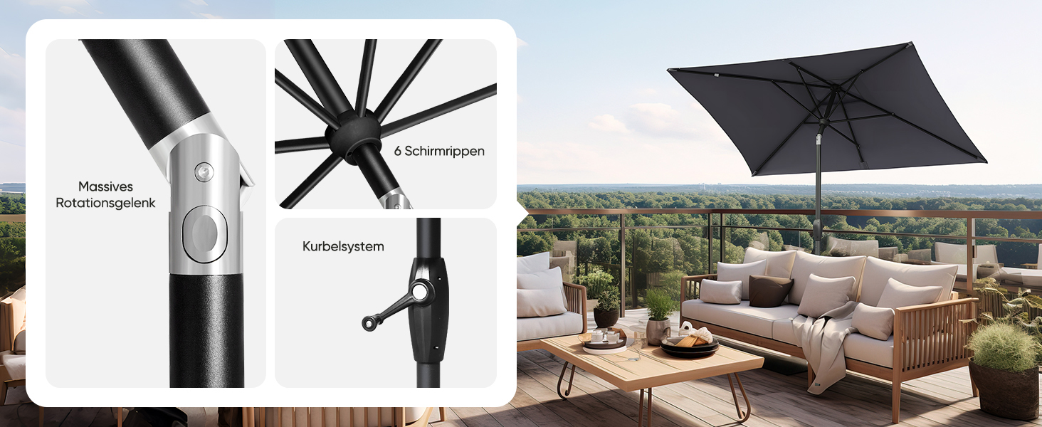 Wow, mit diesem 3-Meter-Schirm hast du deine persönliche Schattenoase! Die Kurbelmechanik ist super smooth - mit wenigen Umdrehungen ist der Schirm aufgespannt. Das Aluminium-Gestell ist nicht nur super stabil, sondern auch super leicht - nur etwa 5 kg Gewicht.
