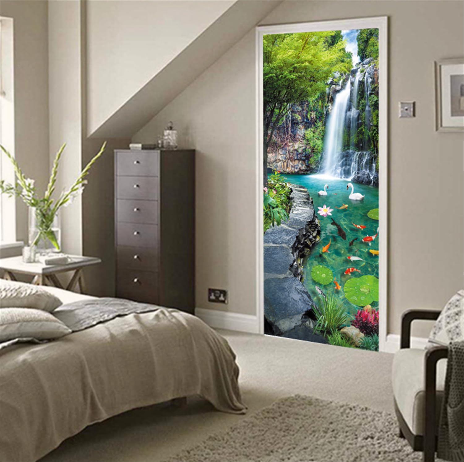 Wow, mit diesem 3D Türaufkleber verwandelst du deine langweilige Tür in nen richtigen Hingucker! Das Motiv 'Sonniger Wald' bringt frische Natur-Atmosphäre in dein Zuhause - total beruhigend und schön anzusehen. Die Maße 77 x 200 cm passen auf die meisten Standardtüren, und weil's aus zwei Rollen à 38,5 cm Breite besteht, kannst du es easy anbringen. Das beste: Die Folie ist selbstklebend - kein extra Kleber nötig! Einfach die Schutzfolie abziehen, positionieren und mit nem Plastikschaber Luftblasen rausschieben. Wenn's dir nicht gefällt oder du umziehst, lässt sich das Teil rückstandslos wieder entfernen. Aus umweltfreundlichem PVC gefertigt, riecht die Folie nicht und ist absolut unbedenklich für die Gesundheit. Perfekt für Wohnungsmieter, die nicht renovieren wollen, oder für alle, die ihrem Zuhause schnell nen neuen Look verpassen möchten. Ob Schlafzimmer, Bad, Küche oder Wohnzimmer - diese Türdekoration macht überall was her! Einfach abziehen, aufkleben und staunen, wie sich der Raum verändert.