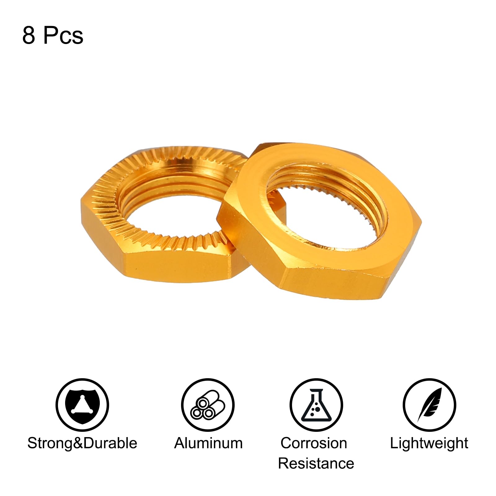 Hey RC-Car-Fans! Diese goldenen Aluminium-Radmuttern von sourcing map geben deinem 1/8 Modellauto den perfekten Look. Im Set sind 8 Stück enthalten - genug für alle vier Räder.\\n\\nTechnische Daten: 17mm Außendurchmesser, M12x1.0 Gewinde, 4mm Dicke und aus hochwertiger Aluminium-Legierung. Leicht, korrosionsbeständig und extrem langlebig. Die großen Kontaktflächen verhindern ein Lösen während der Fahrt.\\n\\nPerfekt für Offroad-Trucks, Geländewagen und alle 1/8 RC-Modelle. Die präzisen Gewinde machen das Anziehen und Lösen super einfach. Kein Gefummel mehr mit billigen Plastikmuttern!\\n\\nDas goldene Finish sieht nicht nur cool aus, sondern ist auch robust. Ein einfaches Upgrade, das sofort ins Auge fällt. Mach dein RC-Auto straßentauglich und hol dir den Wettbewerbsvorteil bei deinem nächsten Rennen!
