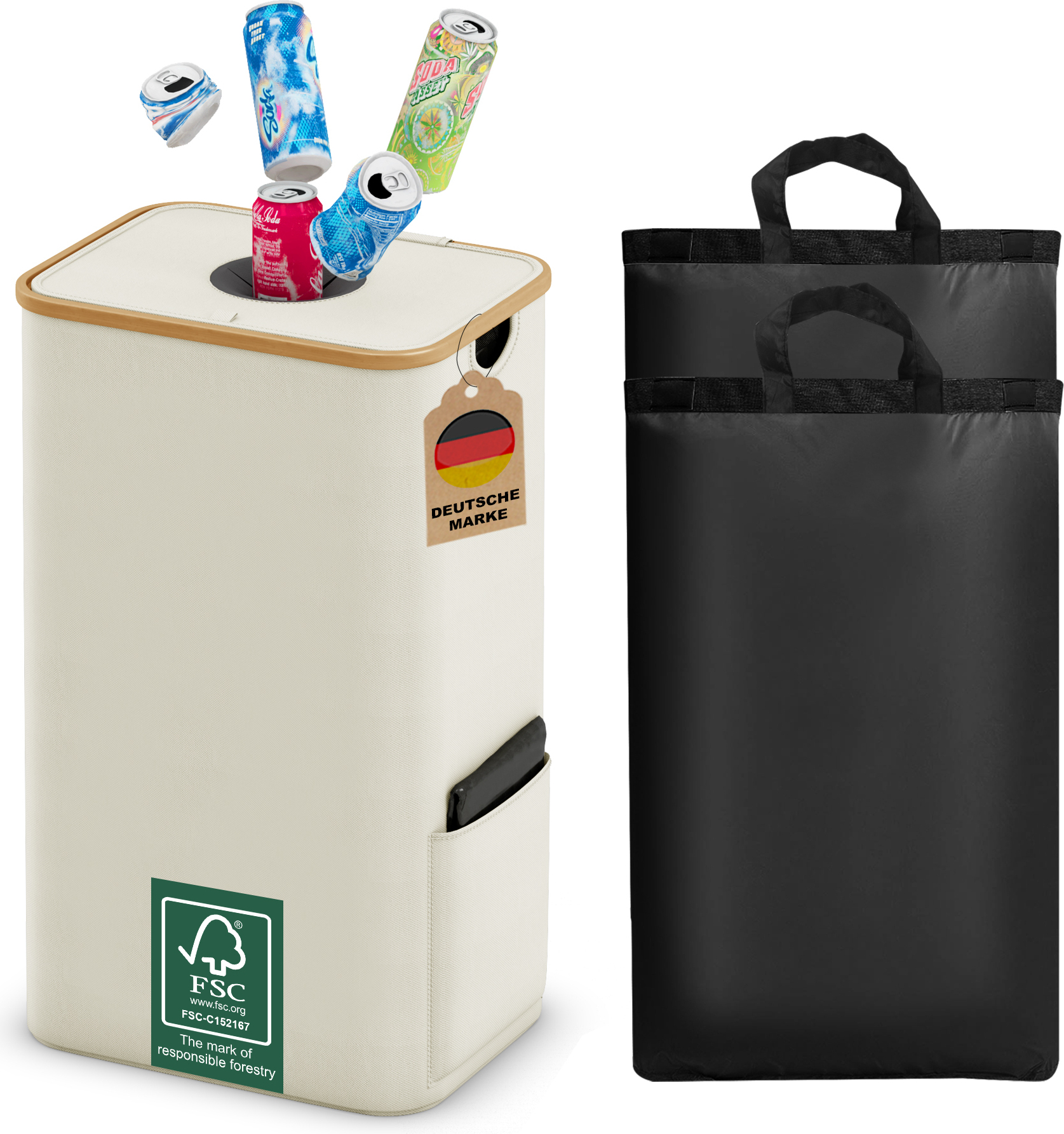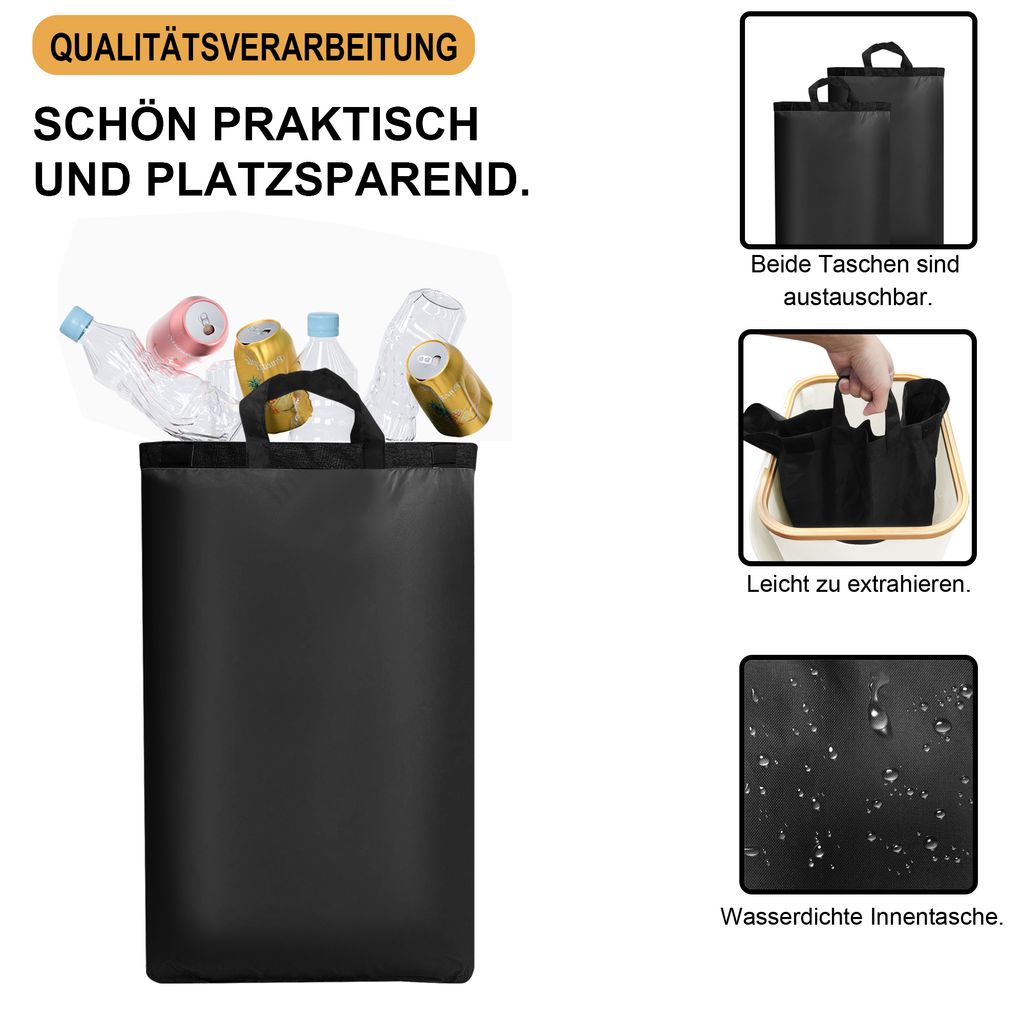 Das geniale Design: Der freihändige Deckel öffnet sich automatisch, wenn du Flaschen einwirfst - super praktisch mit vollen Händen! Mit zwei wiederverwendbaren Innensäcken aus recyceltem Material, die maschinenwaschbar sind.