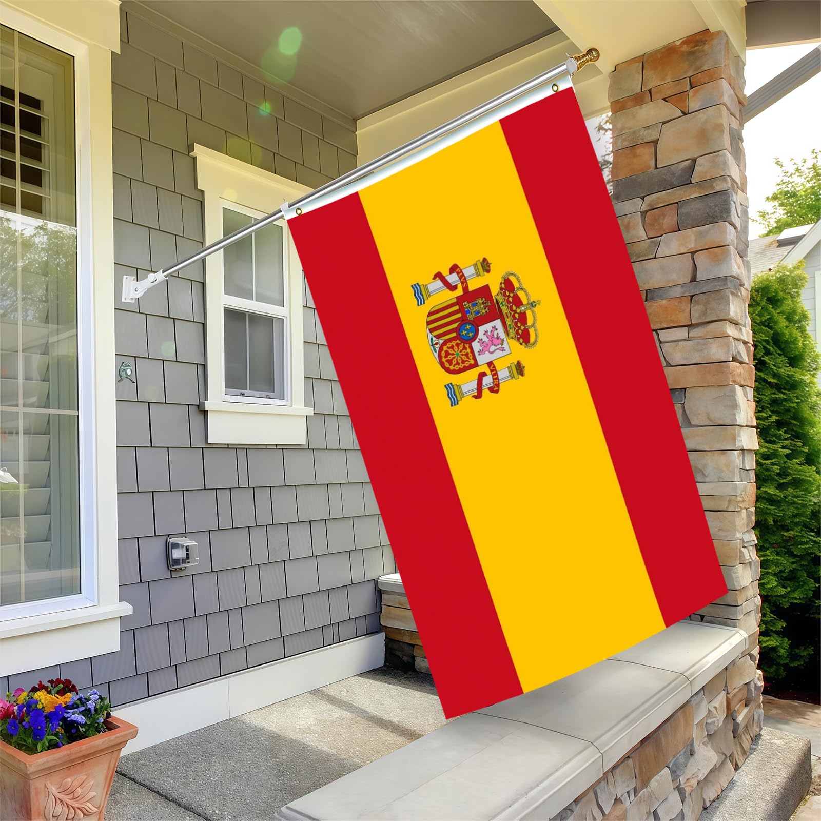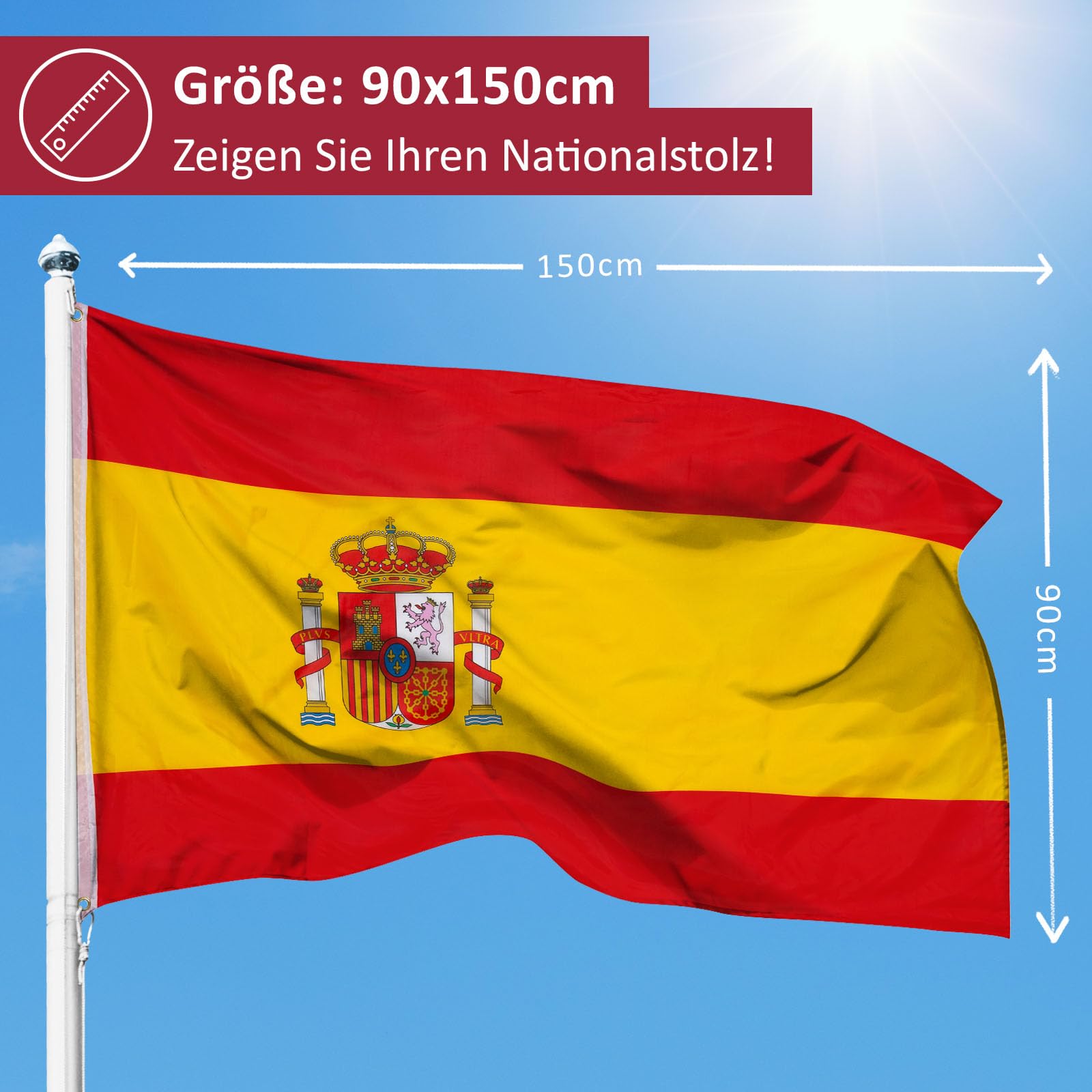 ¡Olé! Hol dir ein Stück Spanien nach Hause mit dieser hochwertigen Nationalflagge. Mit den Maßen 60x90 cm (2x3 Fuß) ist sie perfekt für Garten, Balkon oder Wohnzimmer. Hergestellt aus robustem 150D Polyester, der auch bei Wind und Wetter nicht so schnell reißt oder verblasst. Die lebendigen Farben Rot und Gelb leuchten richtig schön und die doppelseitige Bedruckung sorgt dafür, dass die Flagge von beiden Seiten perfekt aussieht. Die beiden Messingösen machen das Aufhängen super einfach - ob an der Fahnenstange, am Balkongeländer oder einfach nur an der Wand. Perfekt für Fußballfans, Urlaubs-Erinnerungen oder einfach um deine Liebe zu Spanien zu zeigen. Auch für Fiestas, Geburtstage oder Sportevents ideal. Waschbar bei bis zu 50°C - praktisch, oder? ¡Vamos!