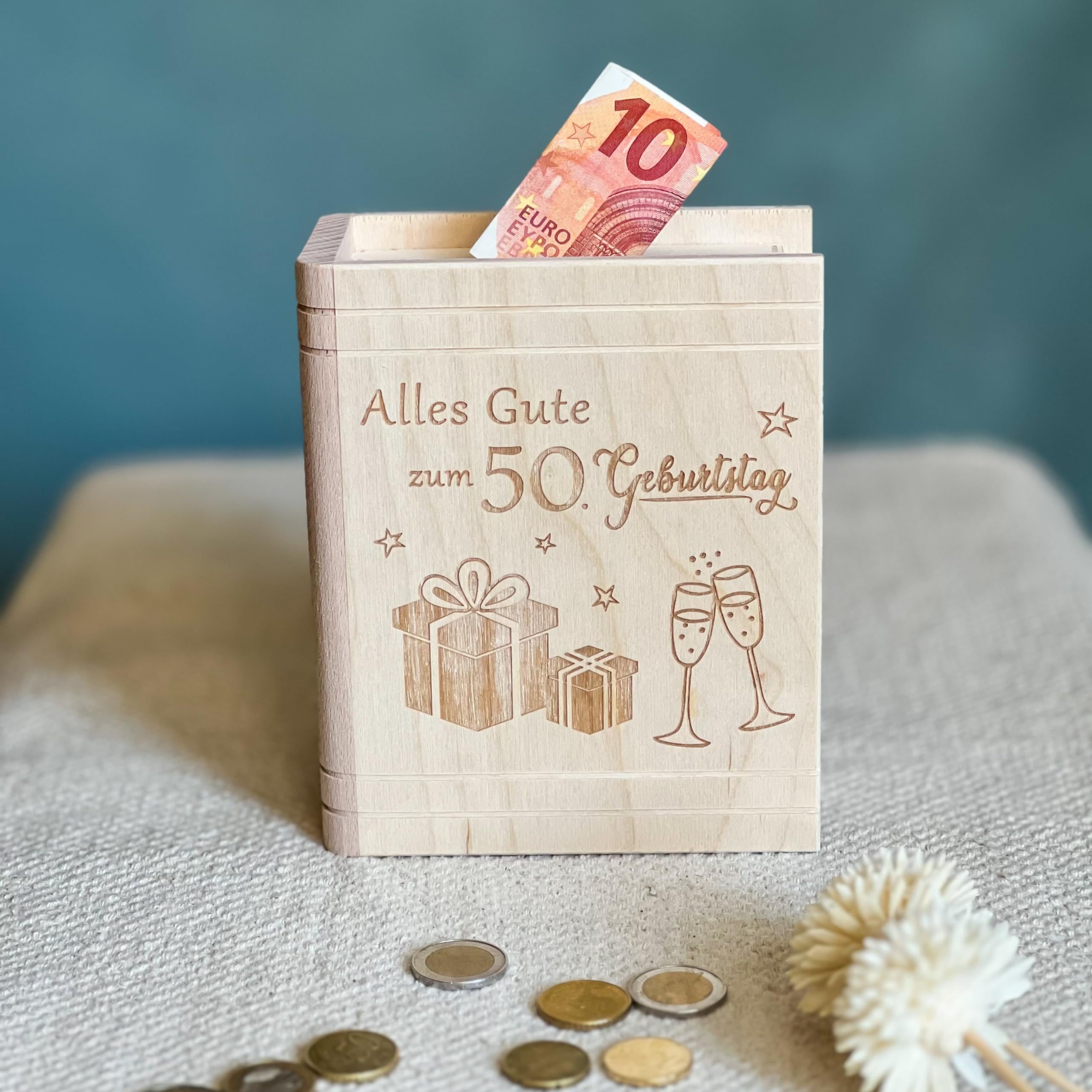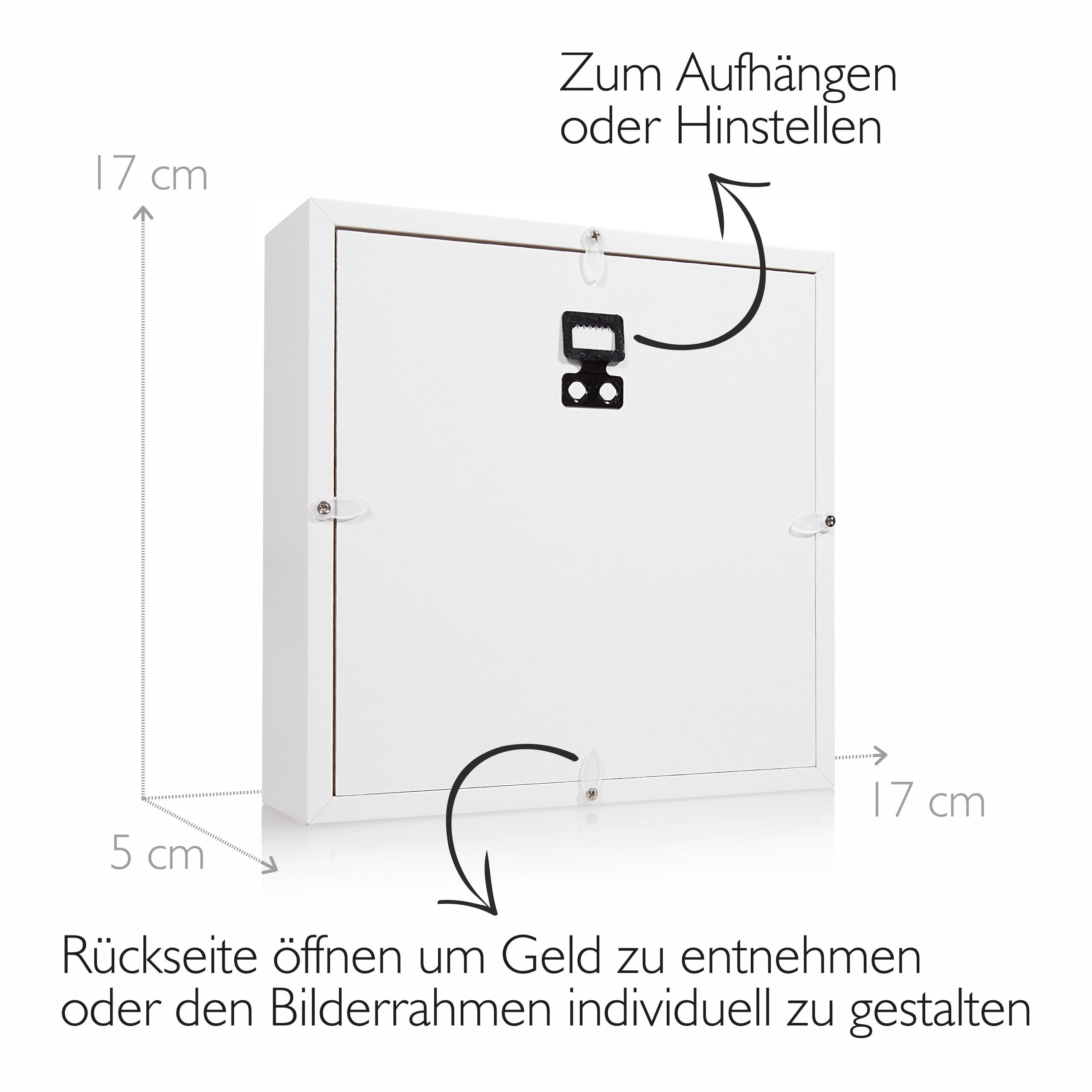 Suchst du eine kreative Art, Geld zu verschenken? Diese süße Spardose im Geburtstagstorten-Design aus massivem Holz ist perfekt! Mit 22 x 22 cm bietet sie genug Platz für Geldscheine und Münzen. Der 3D-Rahmen hat einen praktischen Schlitz zum Einwerfen - aber das Besondere: Du kannst die Rückwand herausnehmen und die Box individuell gestalten! Ob mit Fotos, persönlichen Botschaften oder Deko-Elementen - mach darin ein ganz persönliches Geschenk. Nach dem Auspacken kann der Besitzer die Spardose weiter als Sparschwein oder Bilderrahmen nutzen. Perfekt für Geburtstage, Taufen, Kommunion, Schulanfang oder andere besondere Anlässe. Das weiße Design ist modern und passt in jedes Zimmer. Im Lieferumfang sind sogar ein Anhänger und eine Grußkarte enthalten. So macht Sparen Spaß und Geldgeschenke werden zu etwas ganz Besonderem! Ein Geschenk, das doppelt Freude bringt.