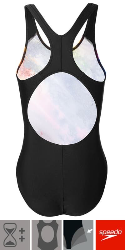 Wasserratten aufgepasst! Dieser Speedo Badeanzug ist perfekt für junge Schwimmerinnen. Im coolen Digital Splashback-Design mit lebhaften Wellen-Prints - einfach mega stylisch! Aus hochwertigem EnduraFlex Material (80% Nylon, 20% Elasthan) - besonders chlorbeständig und formstabil. Mit CREORA HighClo(TM) Technologie - hält auch bei häufigem Schwimmen die Form und Farbe. Die weit abgesetzten Träger geben maximale Bewegungsfreiheit - ideal für Schwimmtraining, Spiel und Spaß im Wasser! Mittlere Beinlänge für optimalen Sitz und Komfort. Vier-Wege-Stretch passt sich jeder Bewegung an. Schnelltrocknend und pflegeleicht - perfekt für Schwimmbad, See oder Meer. Teilweise aus recycelten Plastikflaschen hergestellt - gut für die Umwelt! Einfach anziehen und ins Wasser springen!