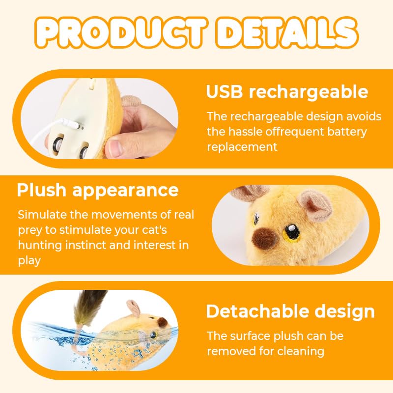 Maus-Alarm für deine Samtpfote! Diese beiden elektrischen Spielmäuse in Gelb und Grau bewegen sich unvorhersehbar und wecken den Jagdinstinkt deiner Katze. Einfach einschalten und zusehen, wie dein Stubentiger begeistert hinterherjagt. Leicht zu reinigen, ohne feste Route – für actionreichen Spielspaß ohne Ende!