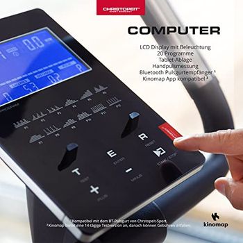 Das LCD Display zeigt dir alles Wichtige: Zeit, Geschwindigkeit, Distanz, Kalorien und Puls (via Hand-Sensoren). Verstellbarer Sattel für perfekte Ergonomie.