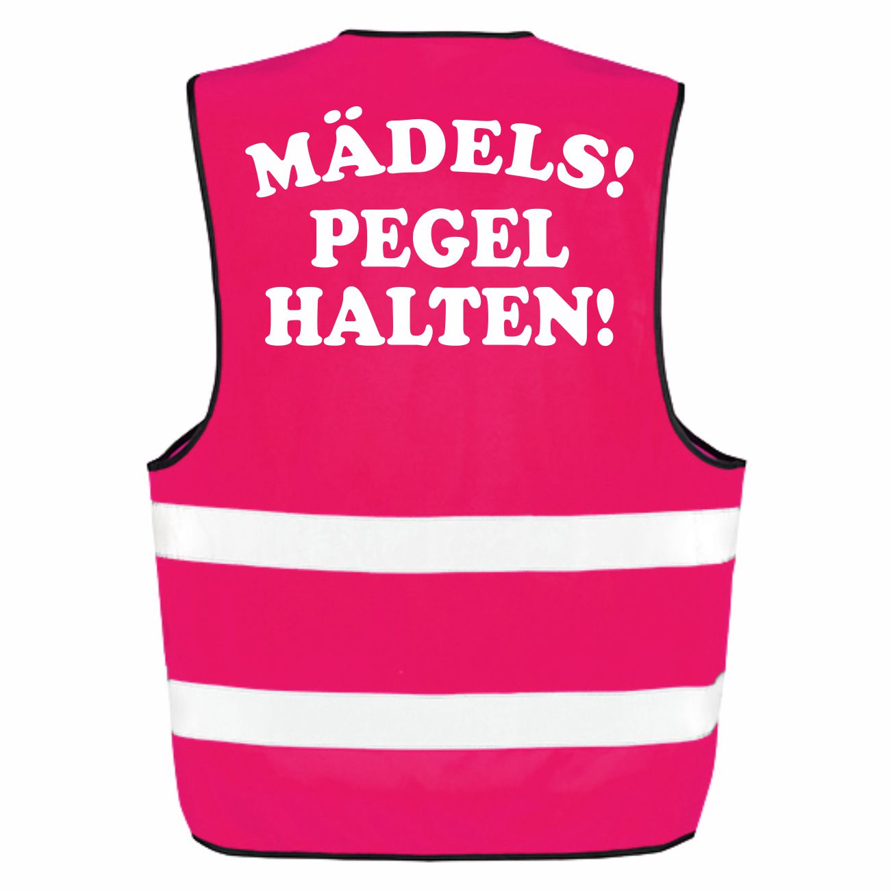 Perfekt für den nächsten Mädelsabend oder Junggesellinnenabschied! Diese pinke Warnweste mit lustigem 'Pegel halten' Spruch sorgt für Stimmung. Mit Reflexstreifen für Sicherheit bei Nacht, zwei Klettverschlüssen für perfekten Sitz über jeder Kleidung. Aus 100% Polyester (120g/qm) mit stylischer schwarzer Saumeinfassung. Druck made in Germany - die Farben halten! Normaler Schnitt für bequemes Tragen. Ob Mallorca, Ballermann oder Stadtfest - mit dieser Weste seid ihr unübersehbar!