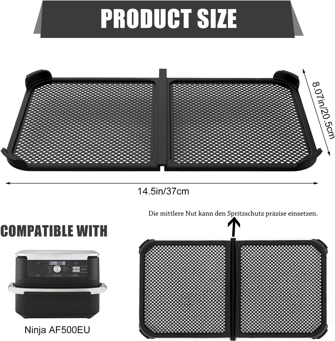 Schütz deine Ninja AF500EU Heißluftfritteuse vor Fettspritzern! Dieser speziell entwickelte Spritzschutz aus Edelstahl und lebensmittelechtem Silikon schützt Heizspirale und Lüfter zuverlässig. Das einzigartige Rillendesign sorgt für stabilen Halt in der Mitteltrennwand - kein Verrutschen! Die gleichmäßig verteilten Löcher garantieren optimale Luftzirkulation für perfekte Kochergebnisse. Hitzebeständig bis 240°C und spülmaschinenfest für einfache Reinigung. Verlängert die Lebensdauer deiner Fritteuse und reduziert lästige Reinigungsarbeiten. Umweltfreundliche Alternative zu Einwegfolien. Einfach zu installieren und zu entfernen. Genieß knusprige Gerichte ohne Fettspritzer in der ganzen Küche. Ein Muss für jeden Ninja AF500EU Besitzer!